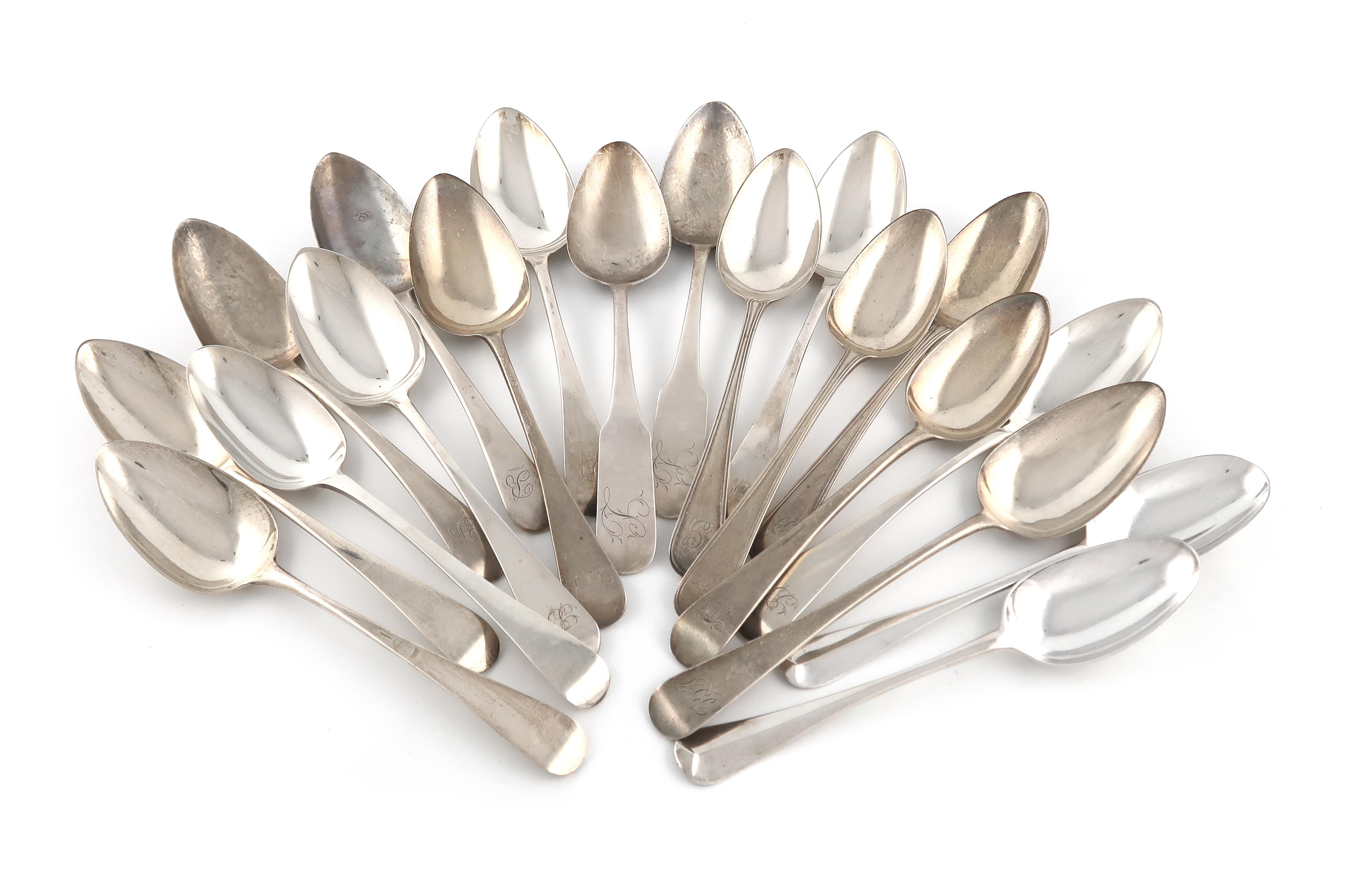 comprising: a George II Hanoverian pair, London 1727, twelve Old English pattern ones, three Old English Thread pattern, and an American pair by John and Peter Targee, New York, circa 1811, approx. total weight 37oz. (qty)