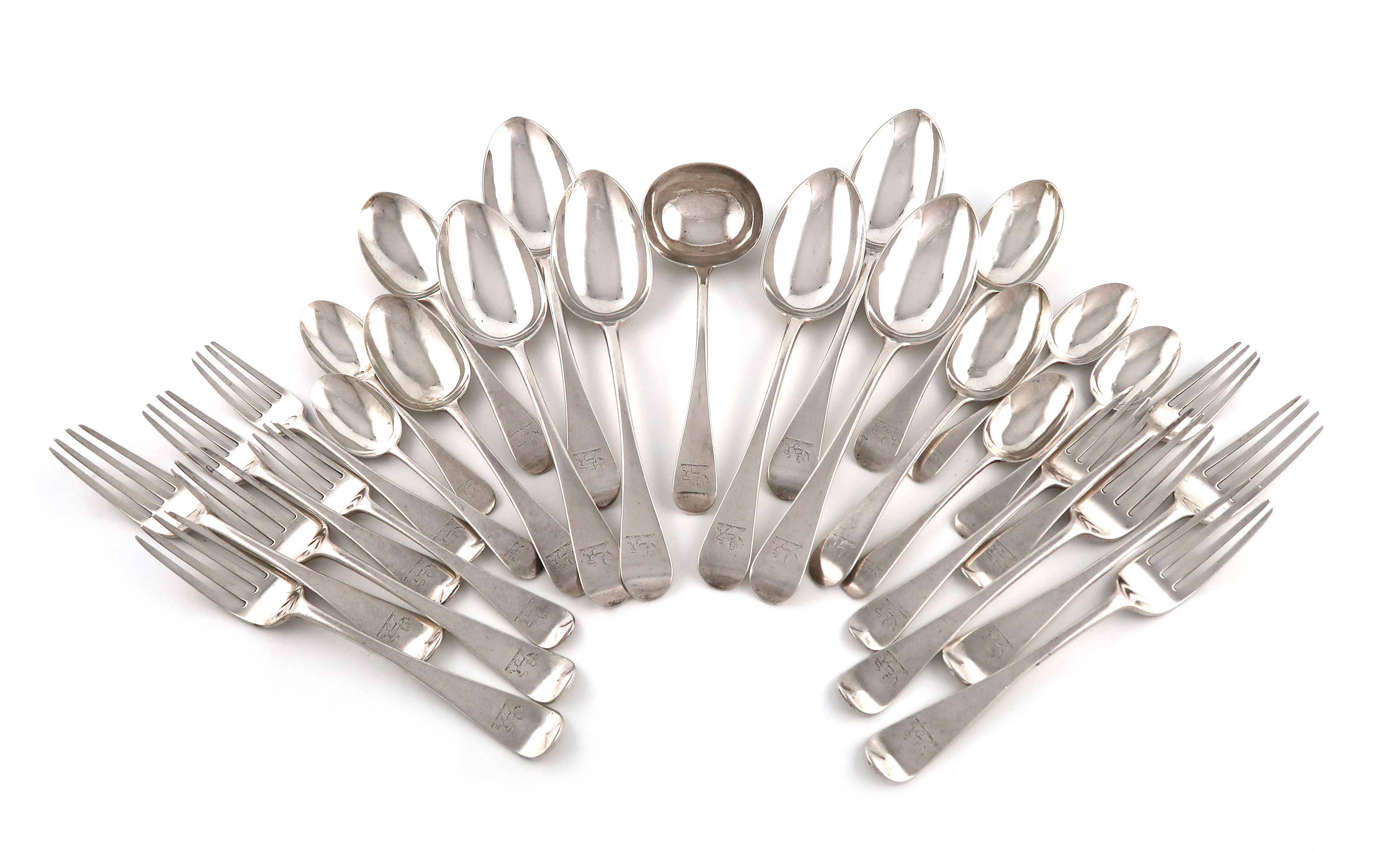 the terminals with a crest, comprising: six tablespoons, six table forks, five dessert forks, four dessert spoons, five teaspoons and a sauce ladle, approx. weight 45oz. (27)