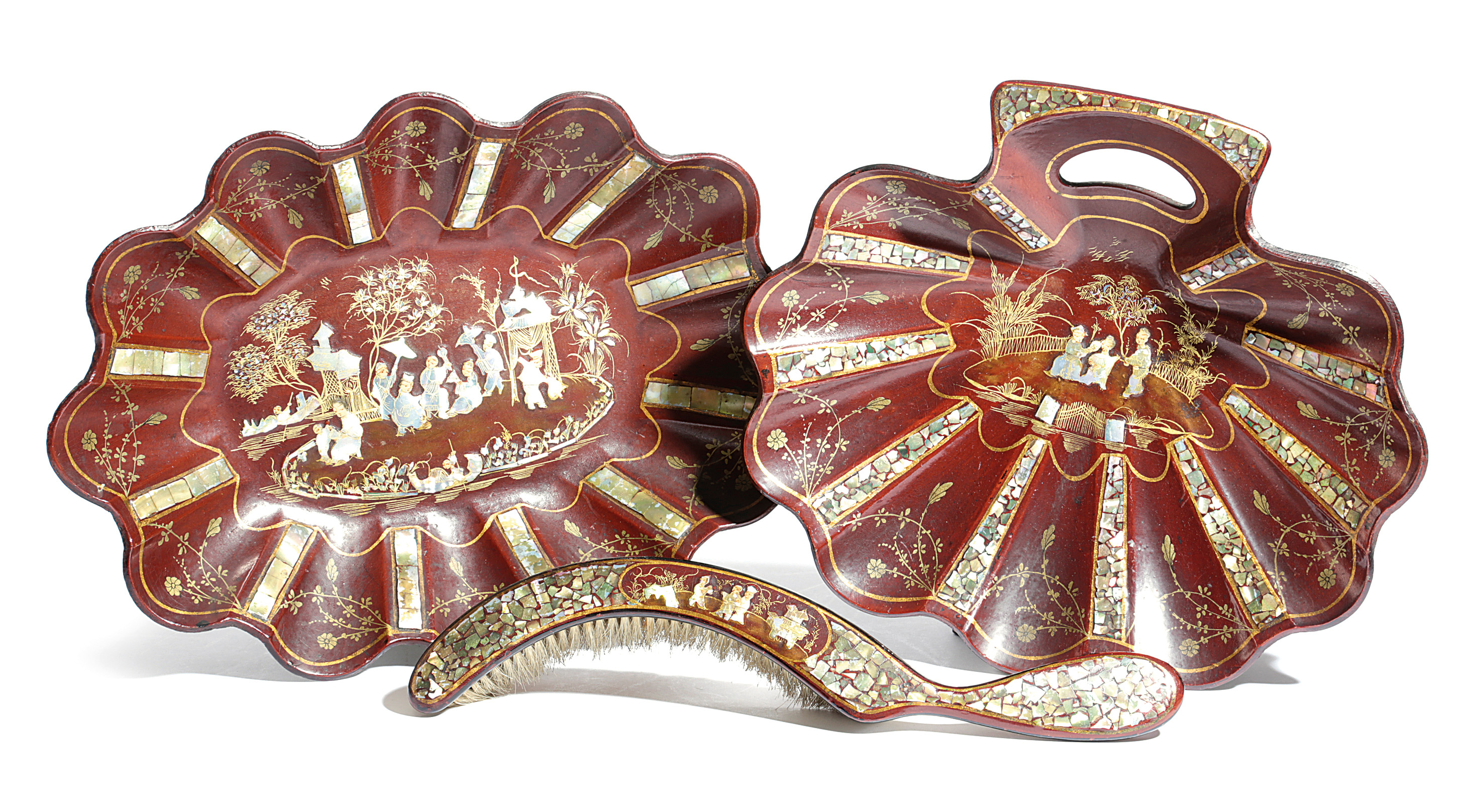 of scallop shape, inlaid with mother of pearl, with a chinoiserie scene, together with a matching crumb tray and brush (3)