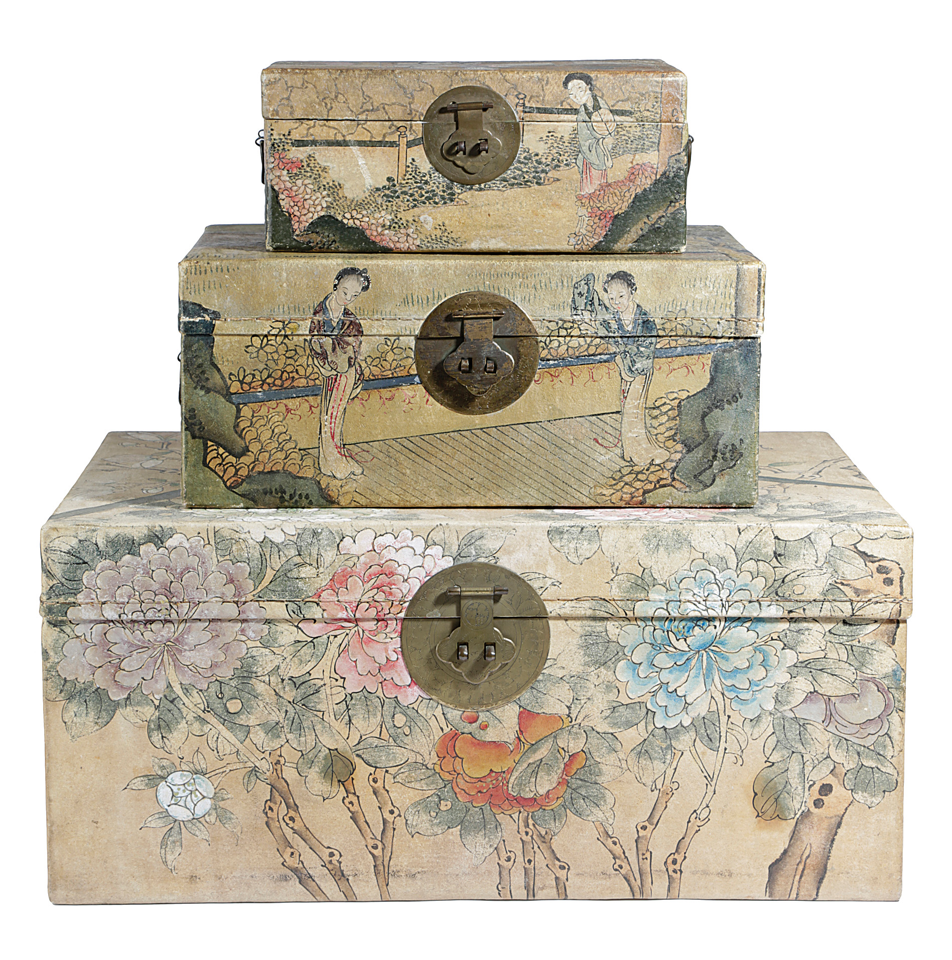 THREE GRADUATED CHINESE VELLUM TRUNKS