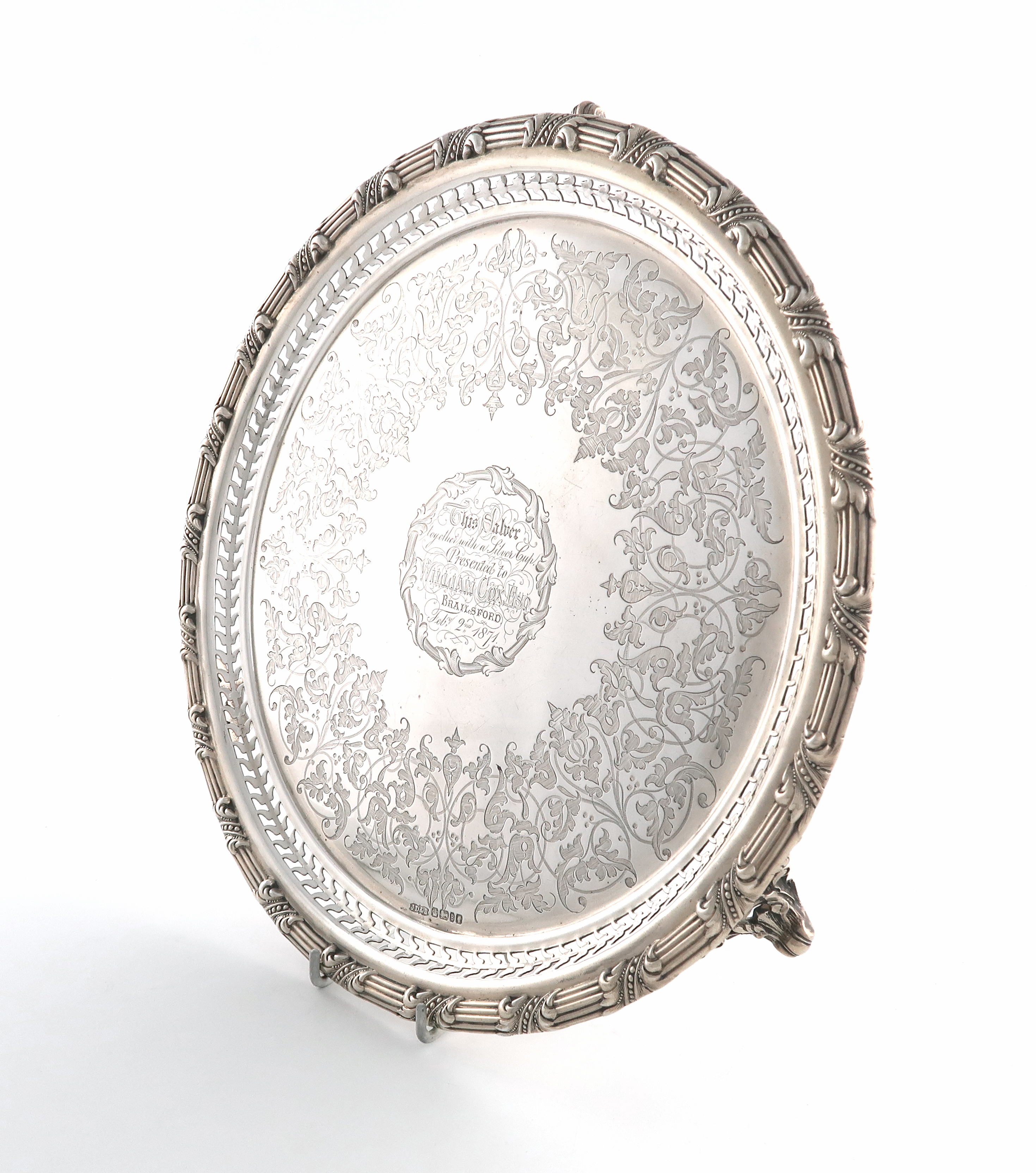circular form, pierced foliate border and with an outer border of foliate and reed decoration, the centre with engraved foliate decoration, and with a presentation inscription, on three pierced foliate bracket feet, diameter 31.5cm, approx. weight 27.5oz.
