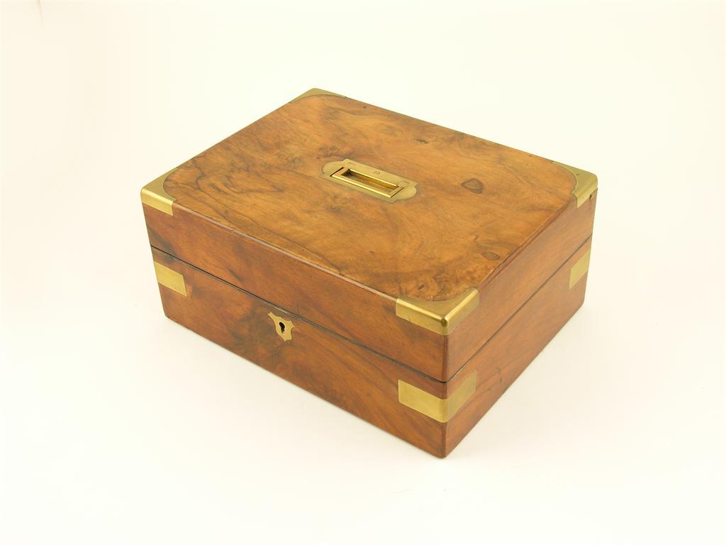 A Victorian walnut and brass bound toilet box, with mirror to a fitted interior with glass bottles, having plates covers, 5.5in (14cm) h, 12in (30cm) w.