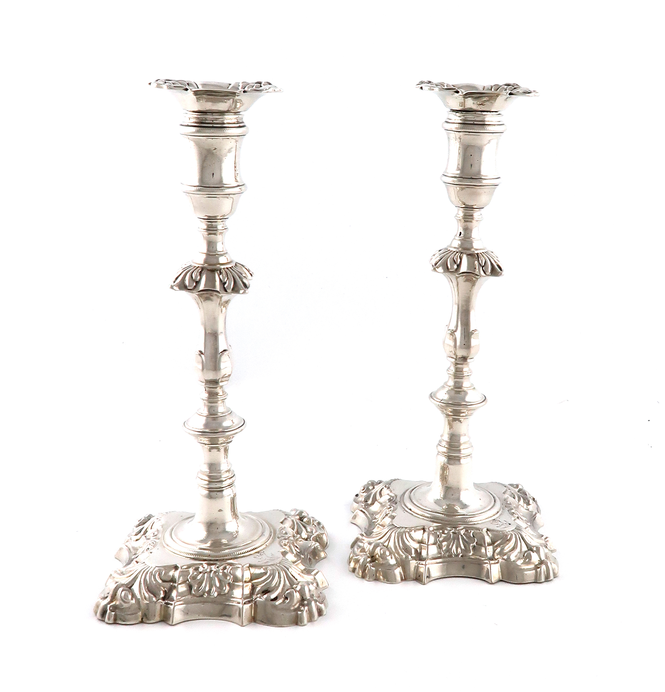 knopped baluster stems, shell capped shoulders, spool-shaped sockets, detachable drip pans, on raised square bases with shell motifs, rope-work borders, engraved with a crest, height 25.4cm, approx. weight 43.5oz. (2)