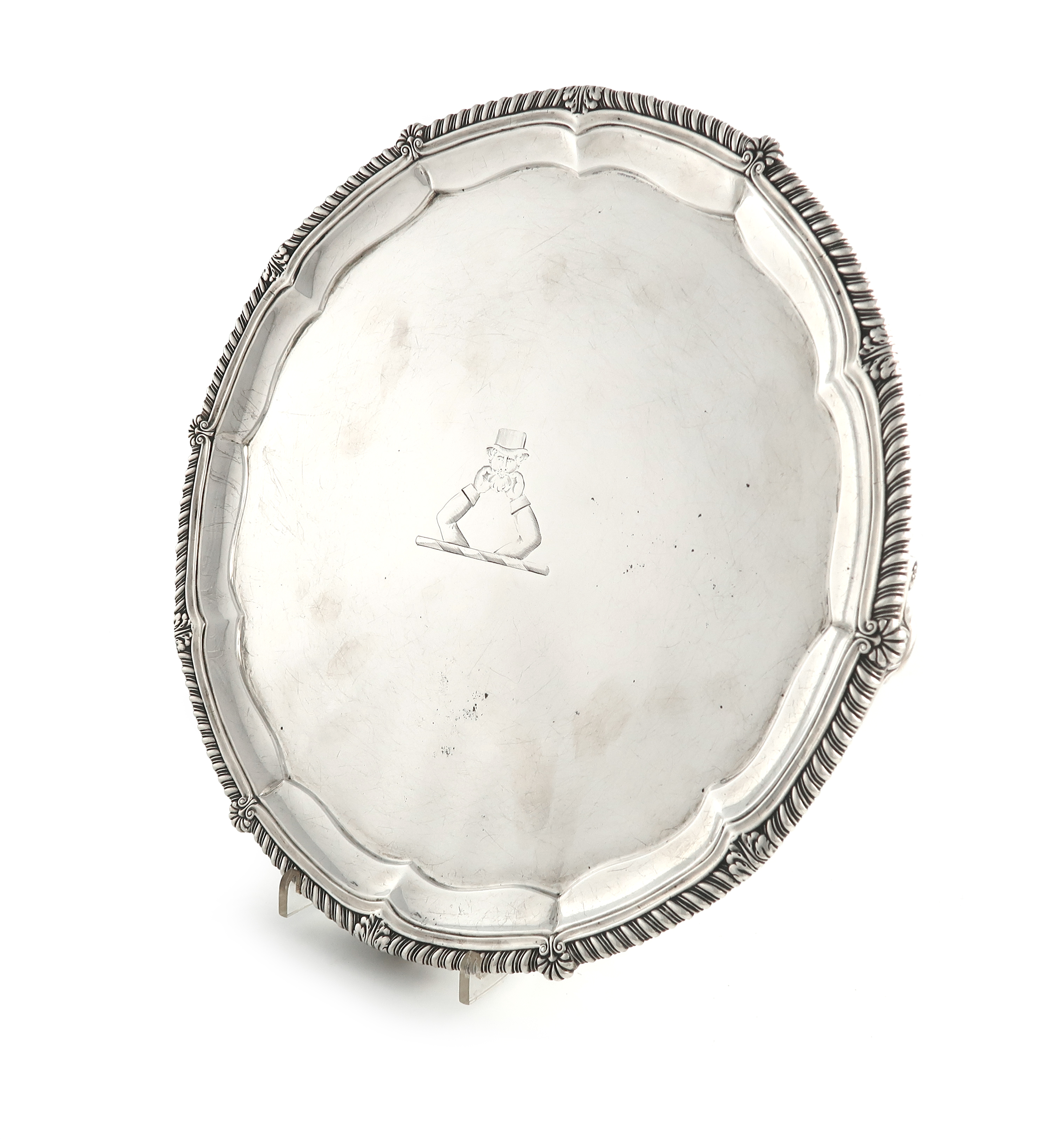 circular form, foliate, shell and gadroon border, on four anthemion bracket feet, engraved with a crest, diameter 33.8cm, approx. weight 42oz.