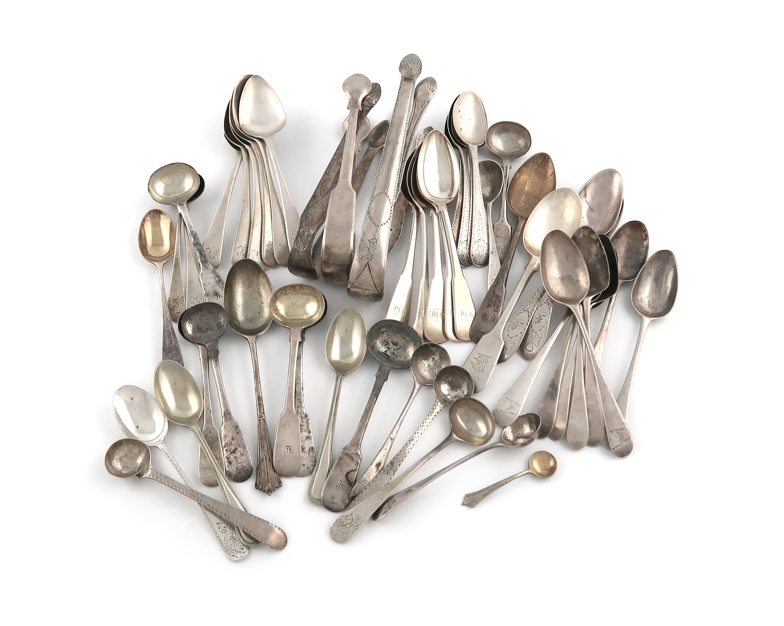 comprising: four pairs of sugar tongs, a matched set of six Newcastle teaspoons, fourteen condiment spoons, twenty-four various teaspoons, and four electroplated teaspoons, approx. weight 25oz. (qty)