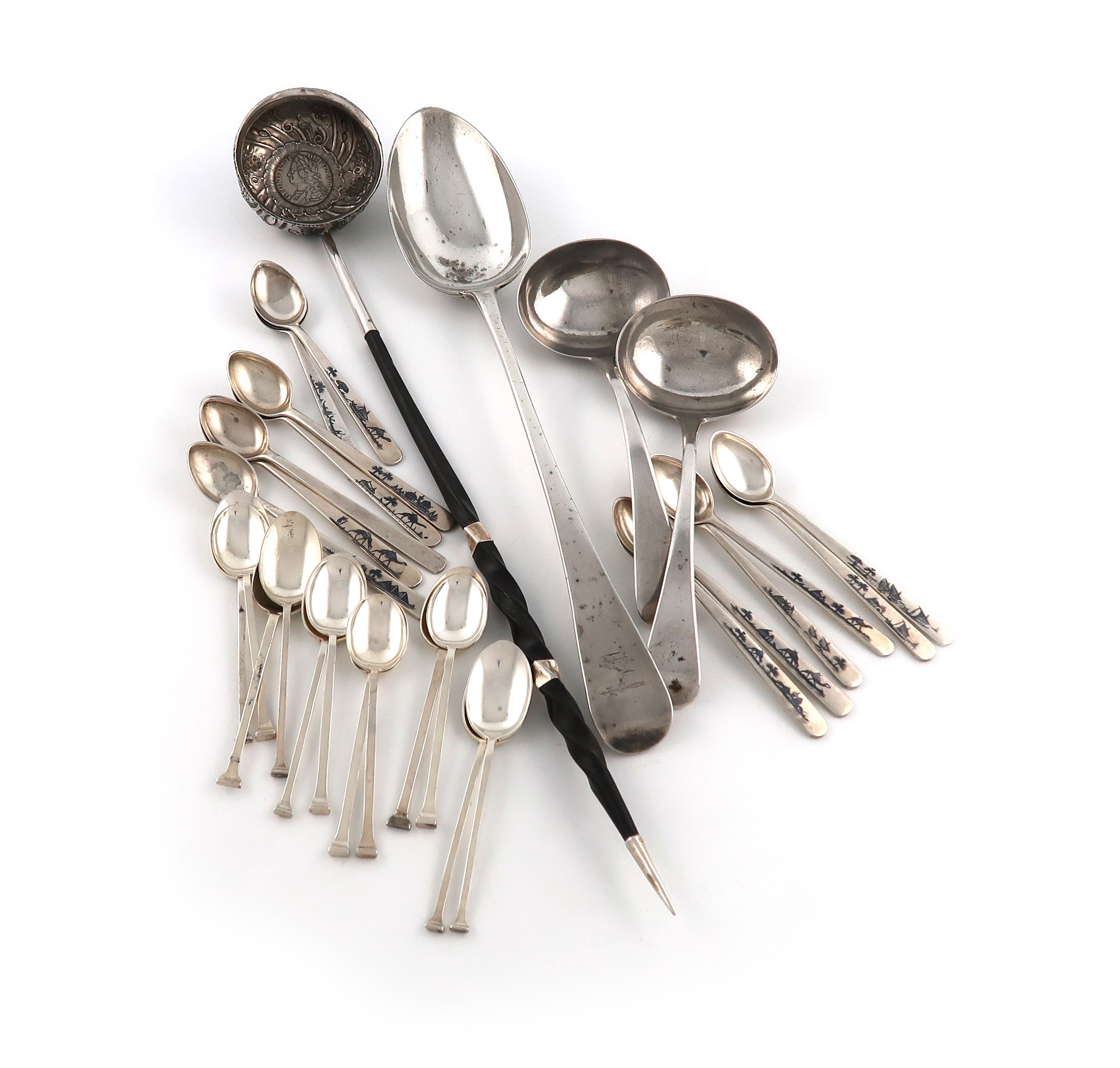 comprising: a Victorian Old English pattern basting spoon, by George Adams, London 1842, a pair of sauce ladles, London 1807, a toddy ladle, twelve seal-top teaspoons, thirteen Iraqi silver and niello work teaspoons, approx. weighable 14.6oz. (qty)