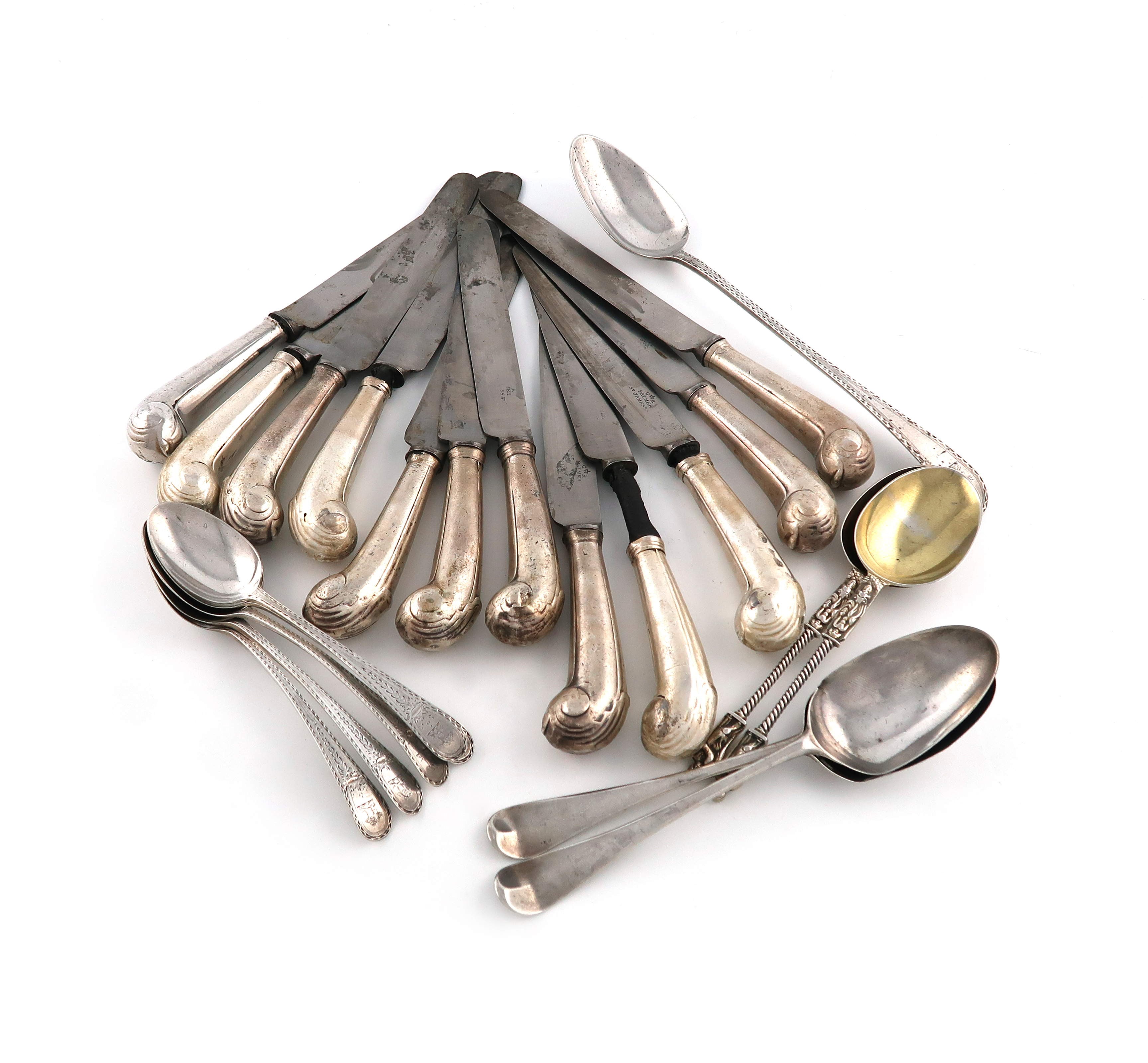 comprising: twelve 18th century pistol grip-handled table knives, two Apostle spoons, London 1884, a Bright-cut pattern basting spoon, London 1785, two Hanoverian tablespoons, and five Bright-cut dessert spoons, approx. weight 13.4oz. (qty)
