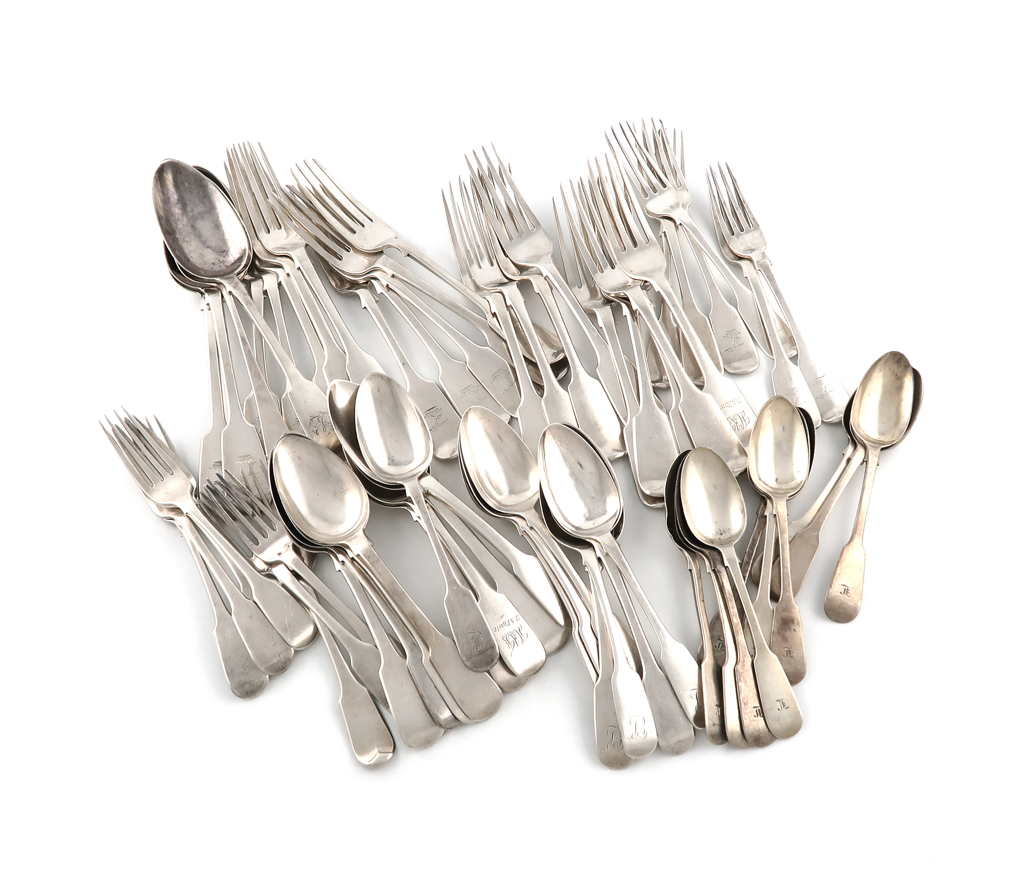 the terminals with crests and initials, comprising: sixteen dessert spoons, nineteen table forks, thirteen dessert forks, three tablespoons, ten teaspoons and an Old English pattern tablespoon, approx. weight 93.8oz. (qty)
