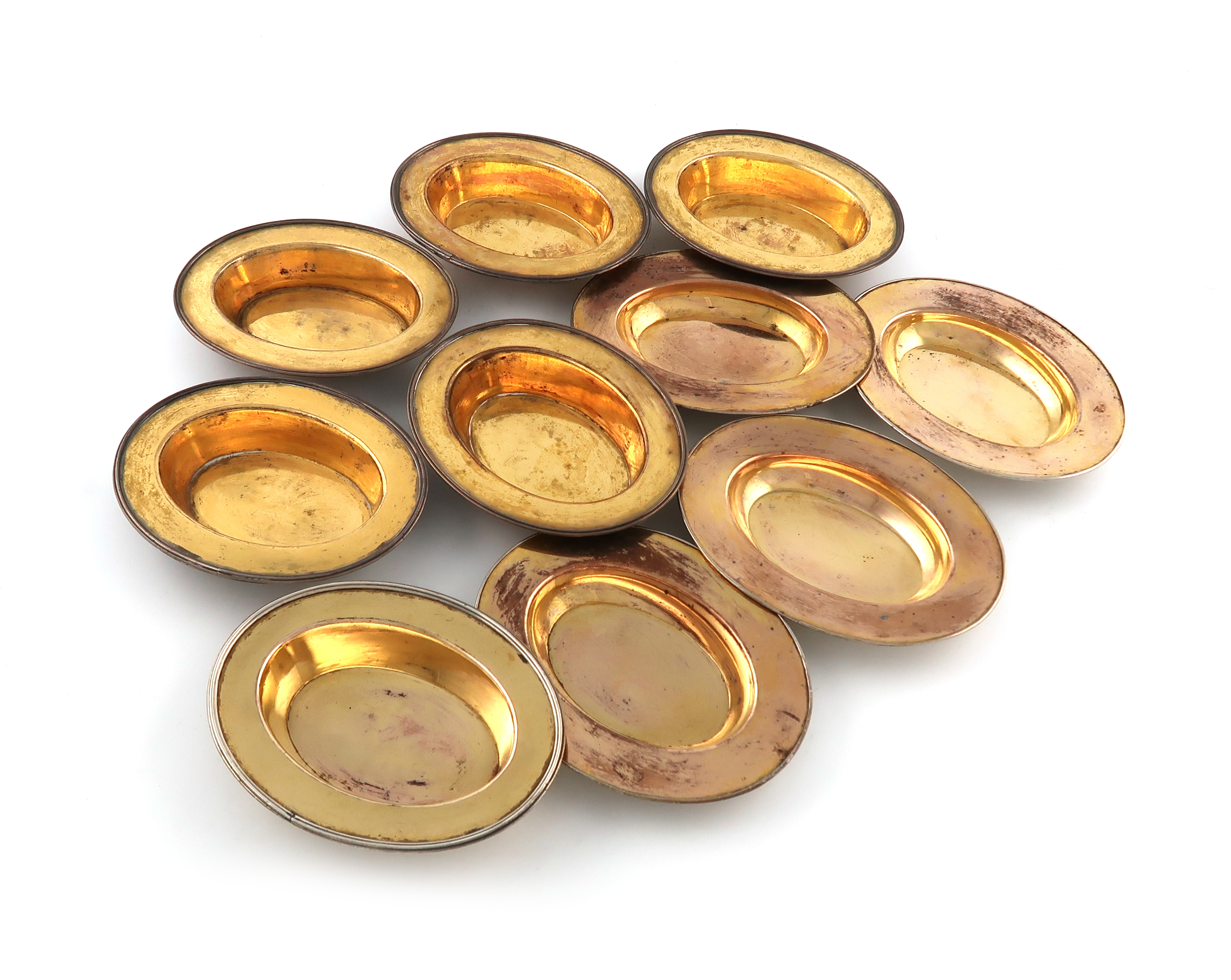 oval form, gilded bowls, some with reeded borders, length 11.7cm. (10)