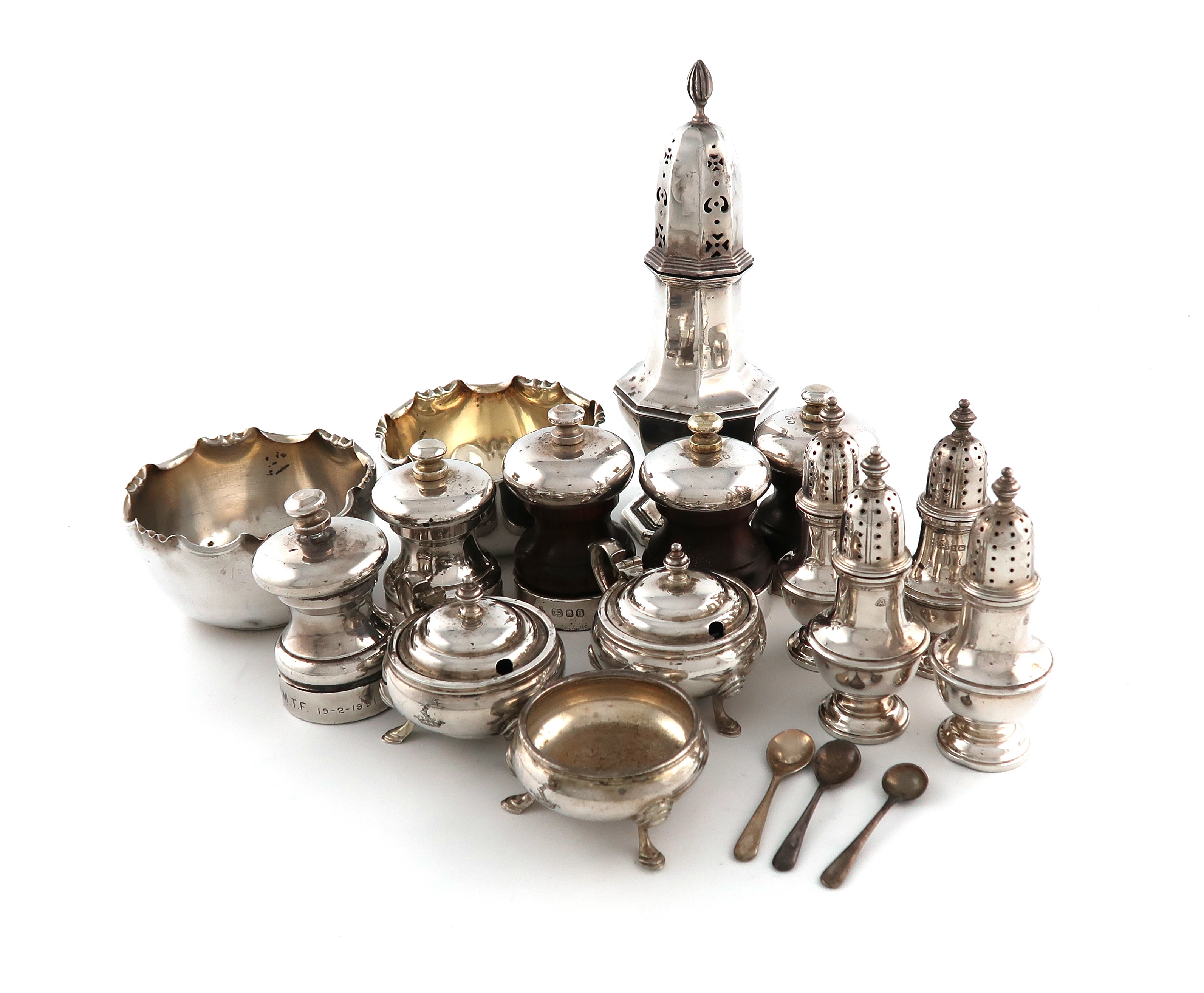 comprising: a sugar caster of octagonal baluster form, a pair of bowls, a pair of mustard pots, a set of four pepper pots, a salt cellar, five pepper mills, and three condiment spoons, approx. weighable 20oz. (qty)