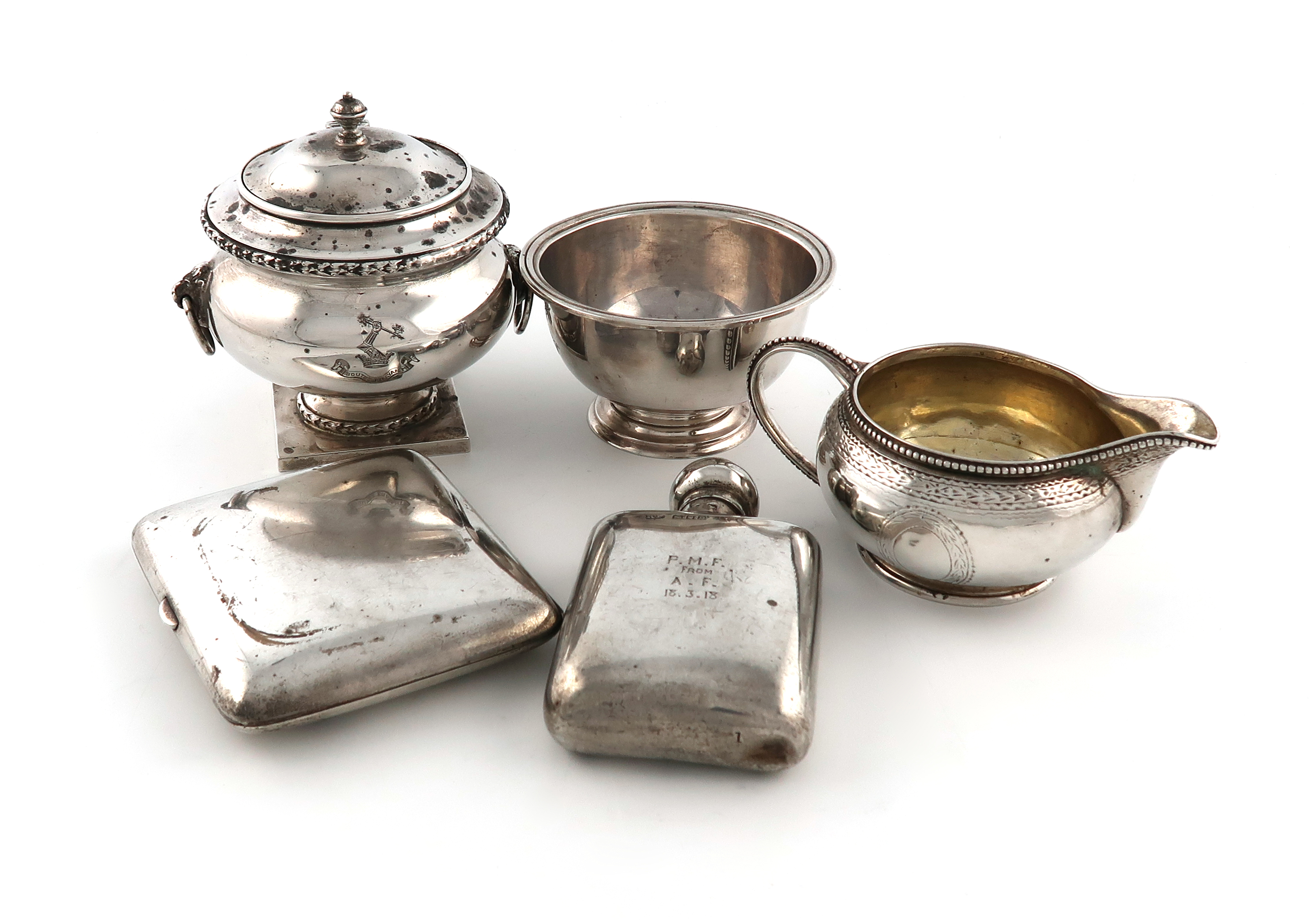 comprising: a tea caddy, by Pearce & Sons, London 1913, circular form, drop ring handles, hinged cover, engraved with the Fowle crest, plus a Victorian cream jug, London 1857, a bowl, a hip flask and a cigarette case, approx. weight 19.7oz. (5)