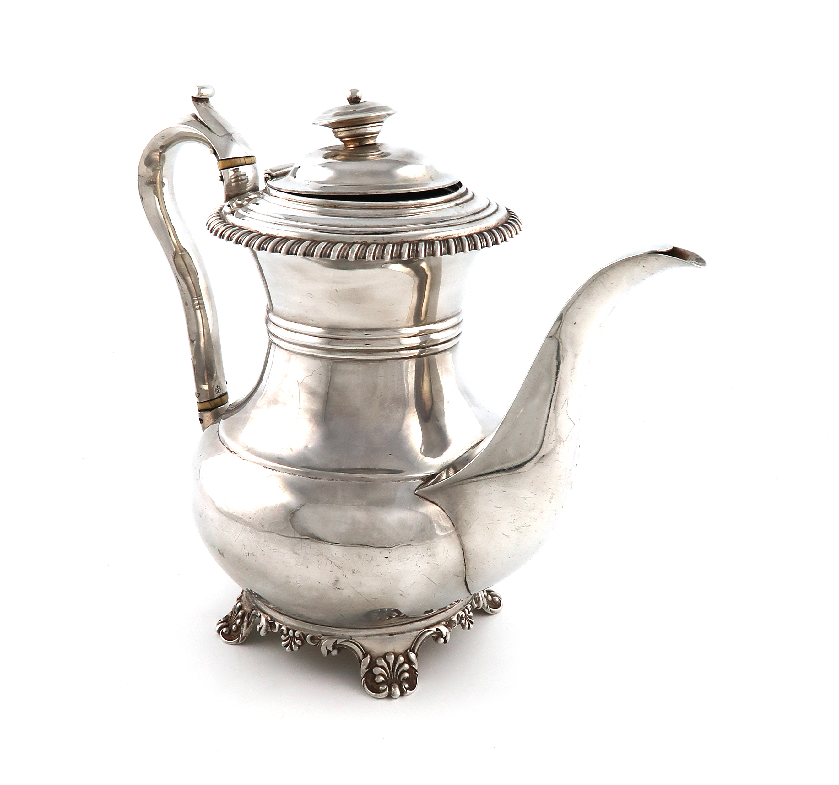 baluster form, the scroll handle with ivory insulators, gadroon border, domed hinged cover, on four shell bracket feet, height 22.5cm, approx. weight 23oz.