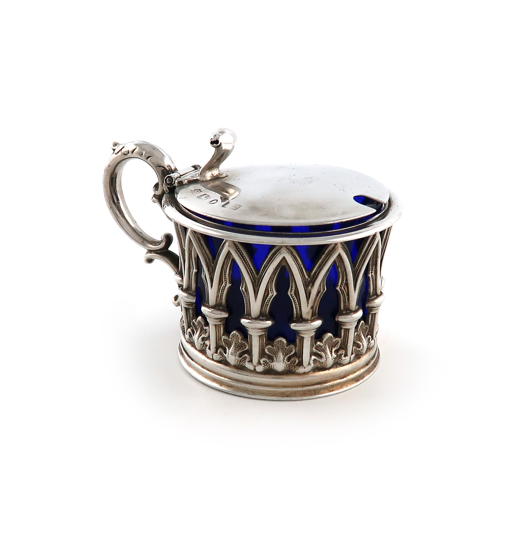 circular form, pierced and embossed with Gothic arches, leaf capped scroll handle, hinged cover with a scroll thumb-piece, engraved with a crest, with a blue glass liner, height 7cm, approx. weight 3.6oz.