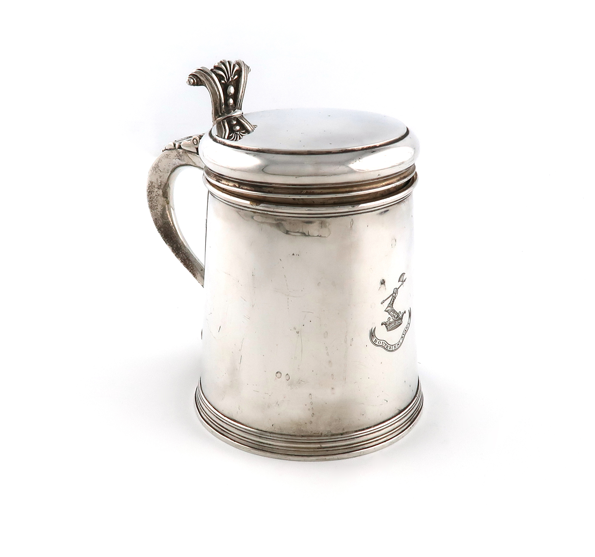 tapering circular form, scroll handle, domed cover with a scroll thumb-piece, engraved with a crest and motto, height 14.5cm, approx. weight 18.5oz.