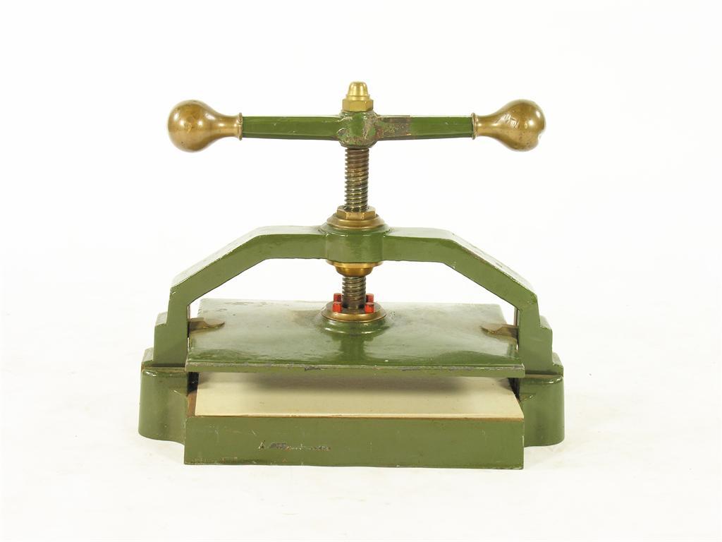A painted cast iron book press, the handle with brass finials, the underside cast a lion and the letter I in a shield, 23.5in (60cm) w.