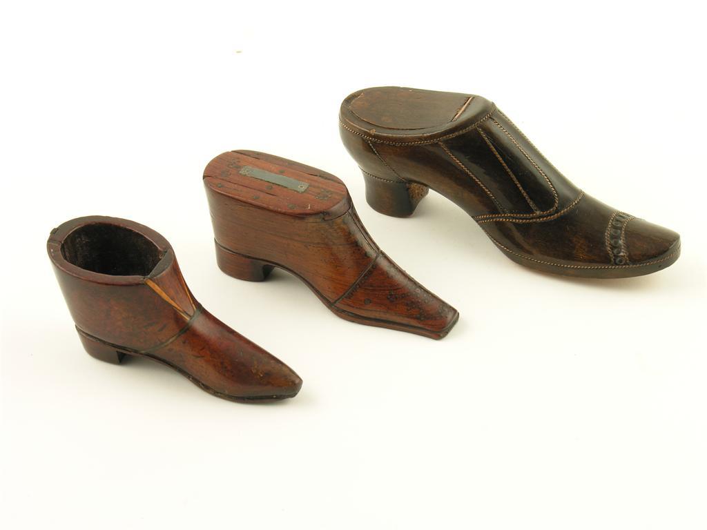 A Victorian rosewood shoe snuff, with brass tack inlay, the sliding cover inset a vacant pewter plaque, 4in (10cm) l, a stained treen snuff shoe, with inlaid copper wire and a hinged cover, 5.5in (14cm) l, and a mahogany shoe snuff, with horn, boxwood and ebonised stringing, cover missing, 3.75in (9.5cm) l. (3)