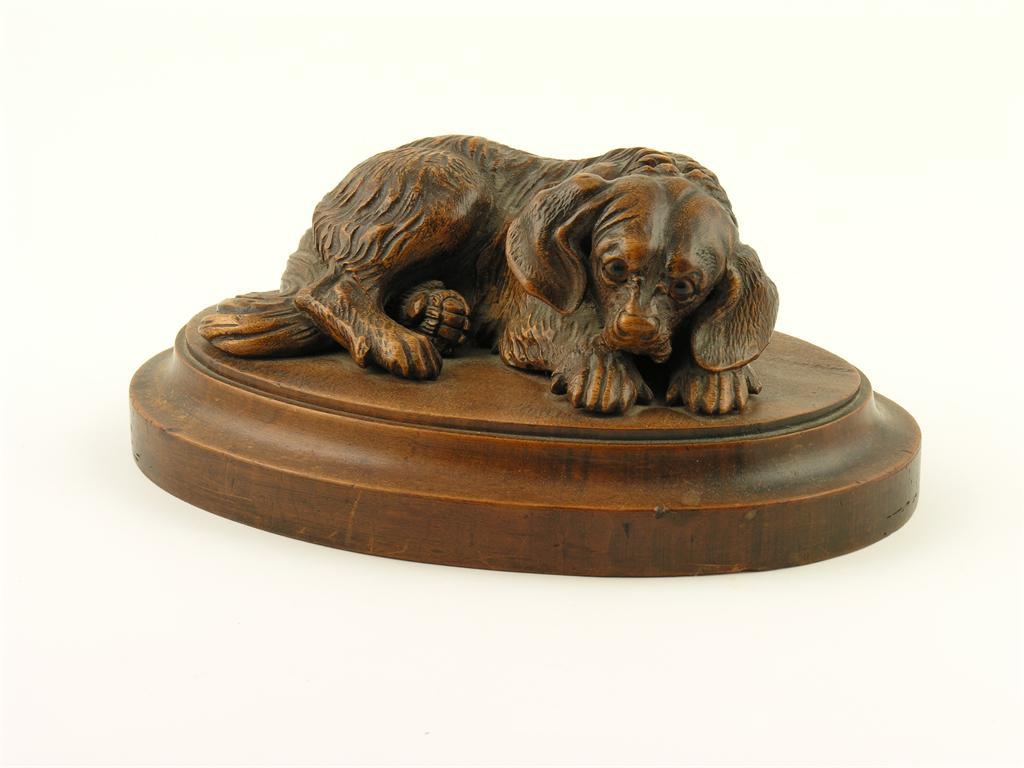 A 19th century carved wood model of a recumbent spaniel