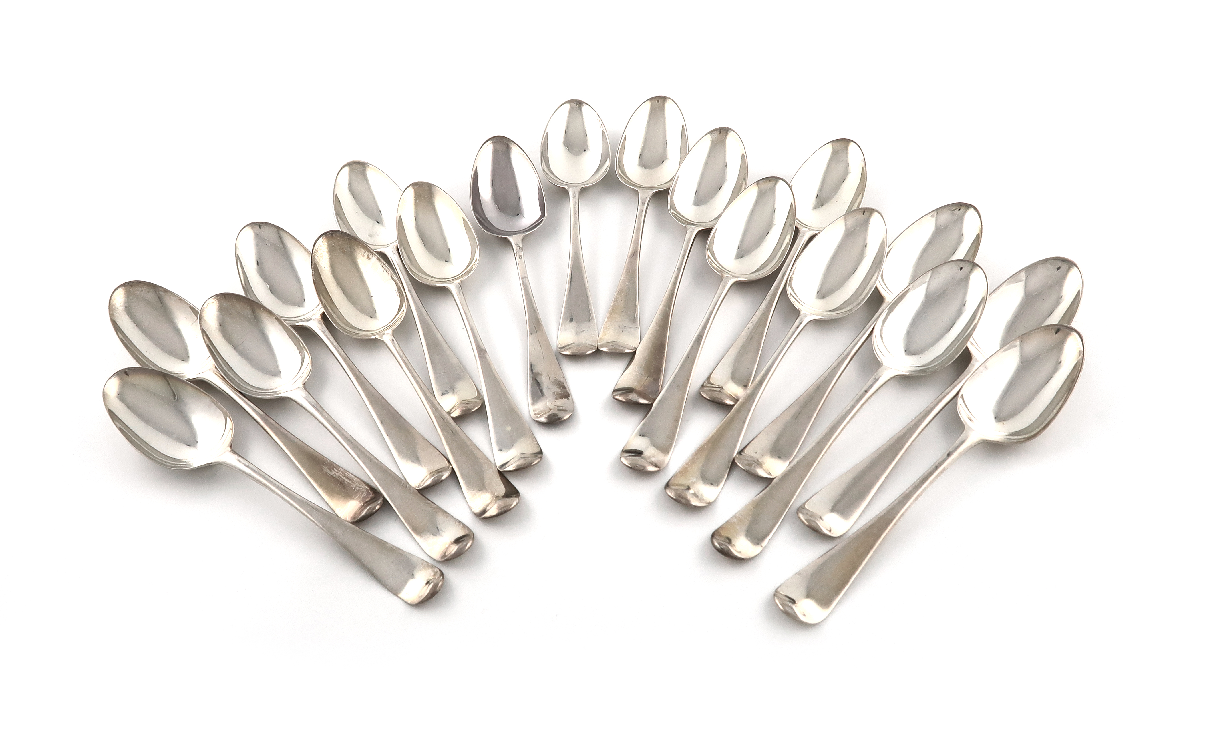 A matched set of eighteen George II/III silver Hanoverian pattern dessert spoons