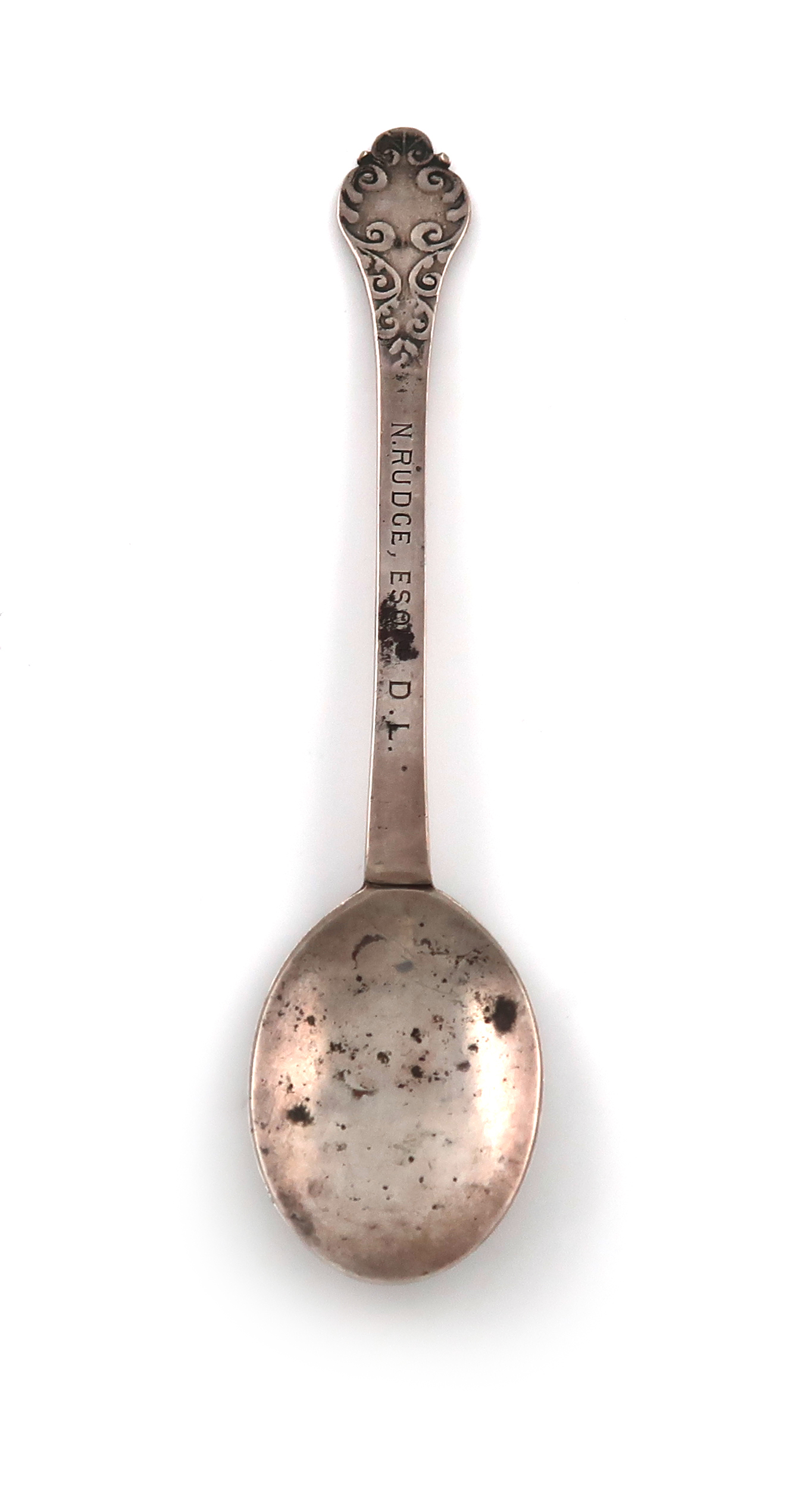 the reverse of the bowl with foliate scroll decoration, the terminal with scroll decoration, the stem later inscribed, and the reverse with a later crest, length 15cm, approx. weight 0.6oz.