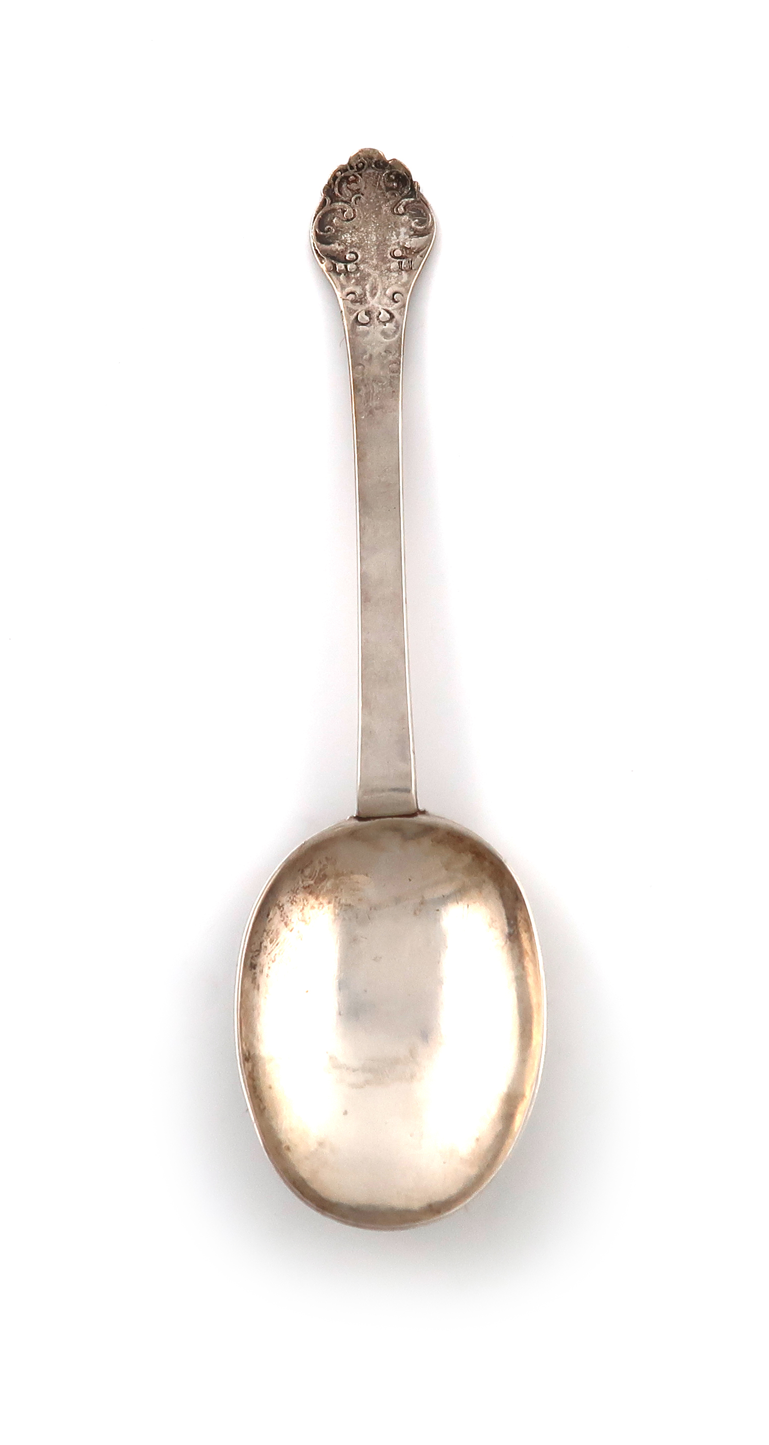 the reverse of the oval bowl with a raised rat-tail and foliate scroll decoration, the terminal also with foliate scroll decoration, the reverse prick-dot initialled 'G.S' over 'S.H', length 19.5cm, approx. weight 1.7oz.