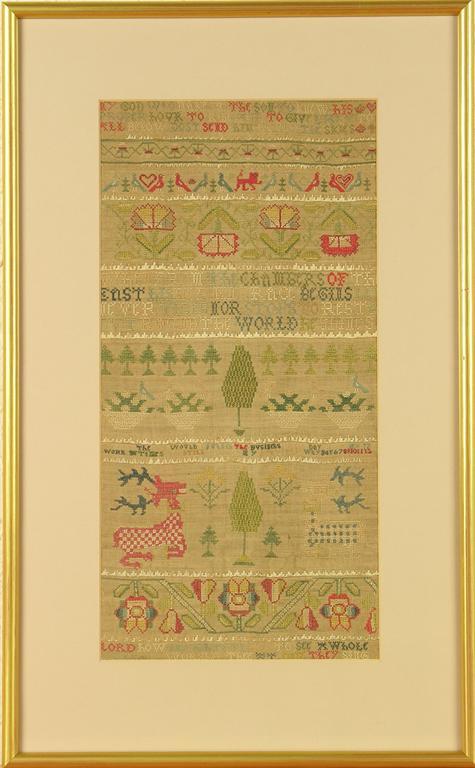 An 18th century sampler, worked bands of verse, strawberries, birds, a lion, trees, flowers and two stags with crowns around their necks, 16 x 8in (40.5 x 20cm.)