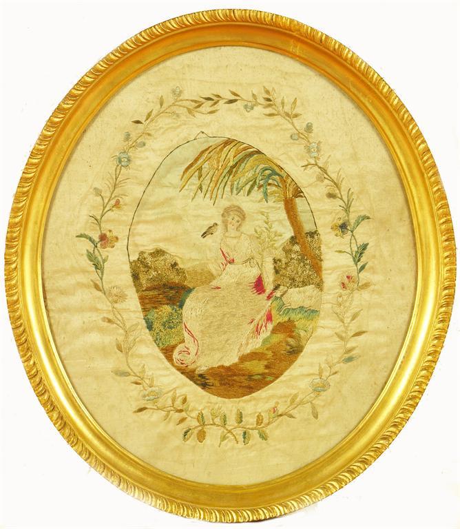A pair of early 19th century oval needlework pictures, silk and wool, depicting a lady playing a lyre and a lady holding an olive branch with a bird perched on her other hand, 14.5 x 12.25in (37 x 31cm), in carved giltwood frames. (2)
