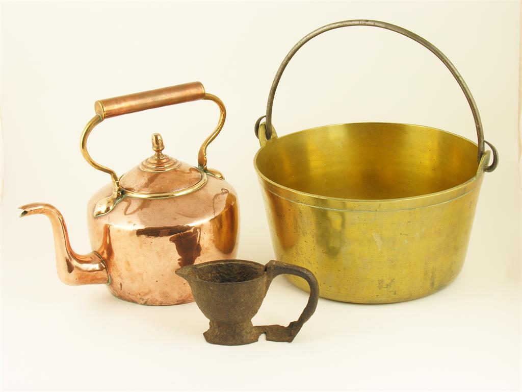 A 19th century copper kettle, the detachable lid with acorn finial, a brass preserving pan with iron swing handle, and an iron jug. (3)