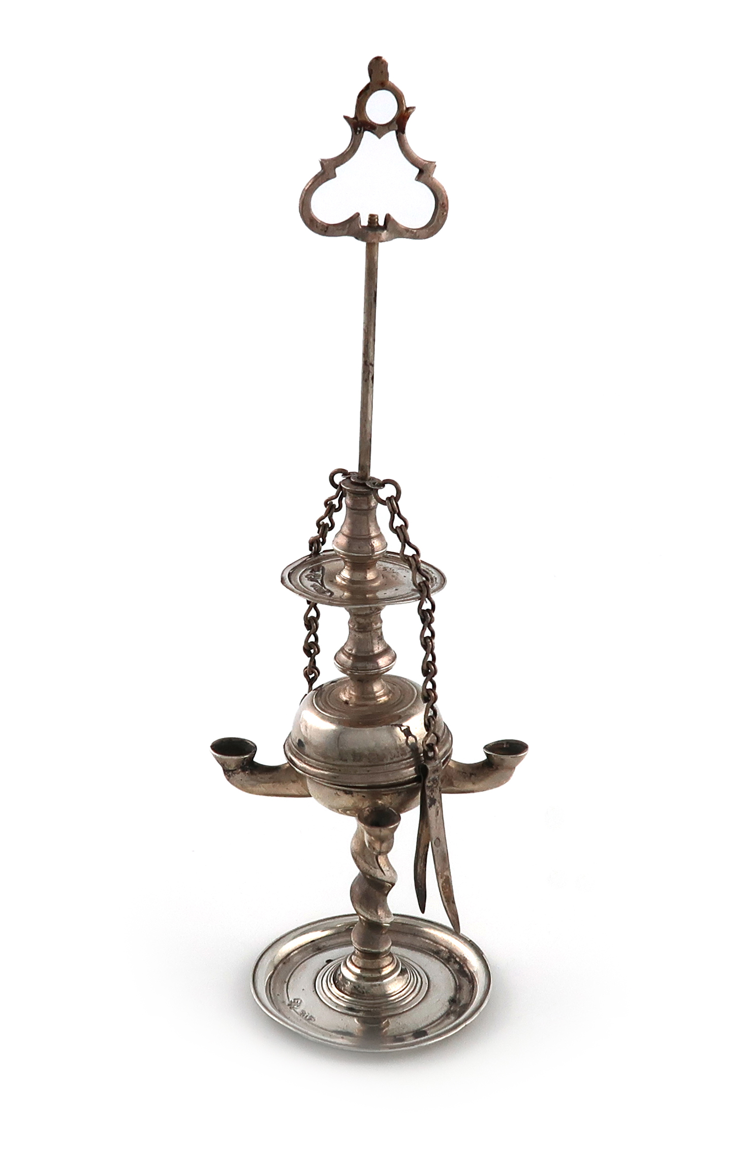 baluster form, swirl stem, with four lamp burners, central handle sliding cover with a pair of tweezers on a chain and a snuffer, on a circular foot, height 21.5cm, approx. weight 5.2oz.