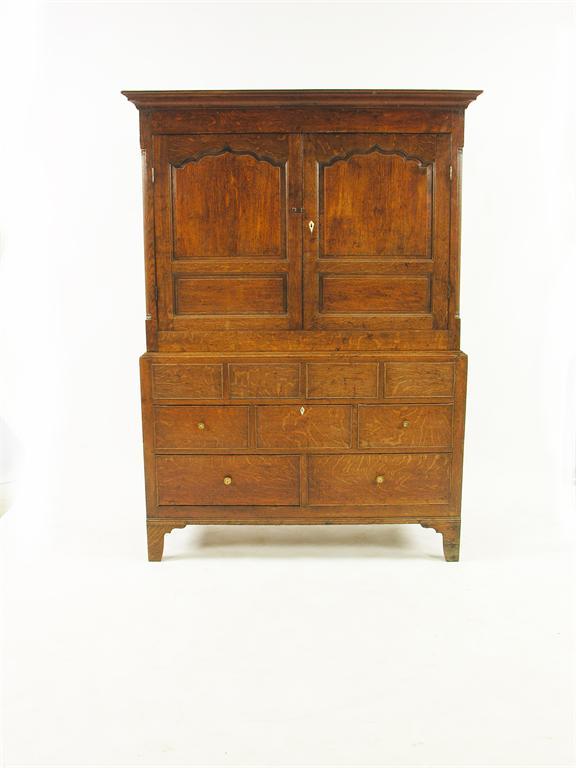 A George III oak North Country linen press, having a pair of ogee moulded fielded panel doors enclosing shelves flanked by quarter pilasters above four false drawer fronts to three and two real drawers fitted later handles on bracket feet, panelled sides, 72.75in (185cm) h, 52.75in (134cm) d, 21.25in (54cm) d.