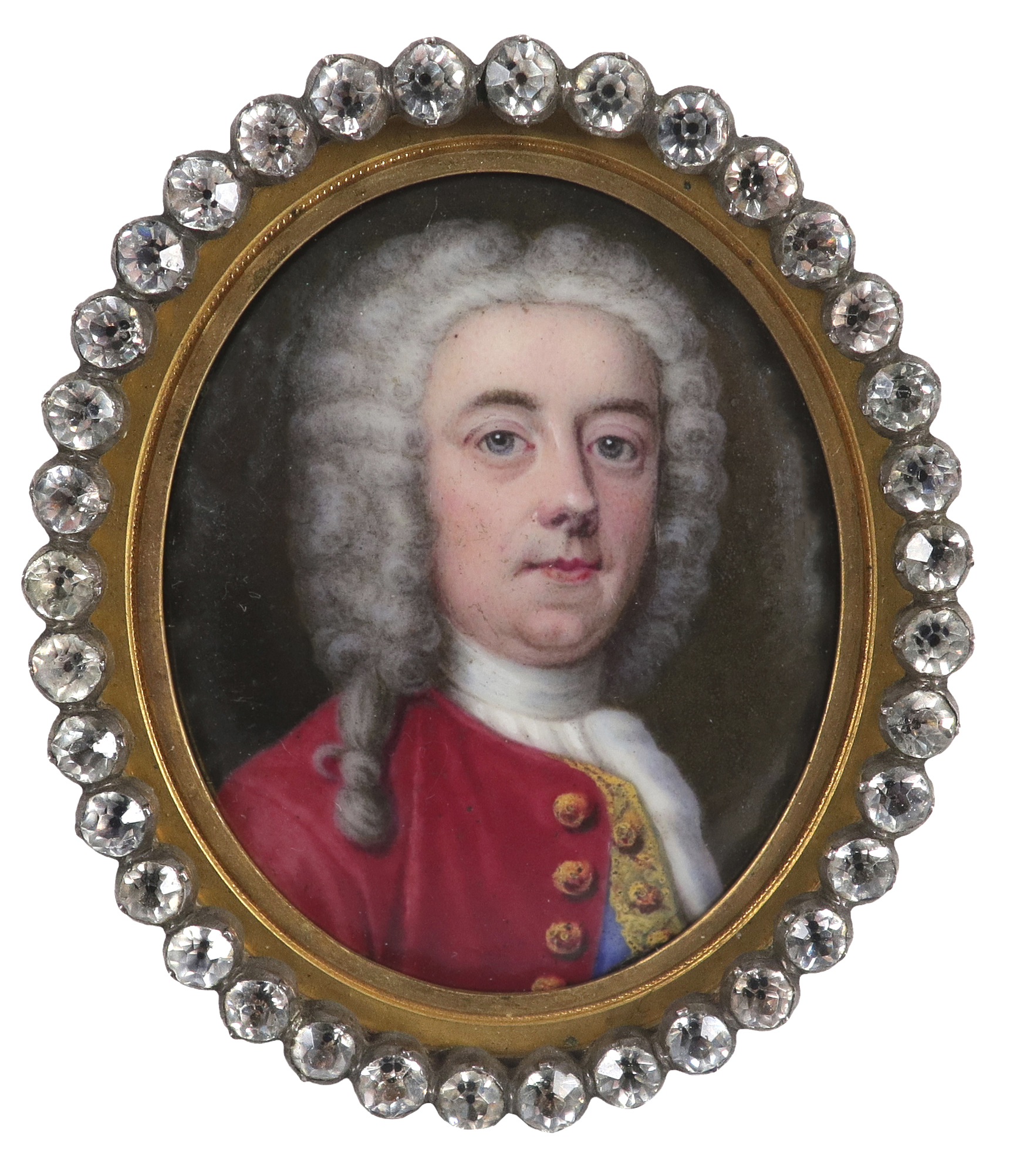 Portrait miniature of a gentleman wearing a red coat, a blue and yellow waistcoat and a powdered long wig