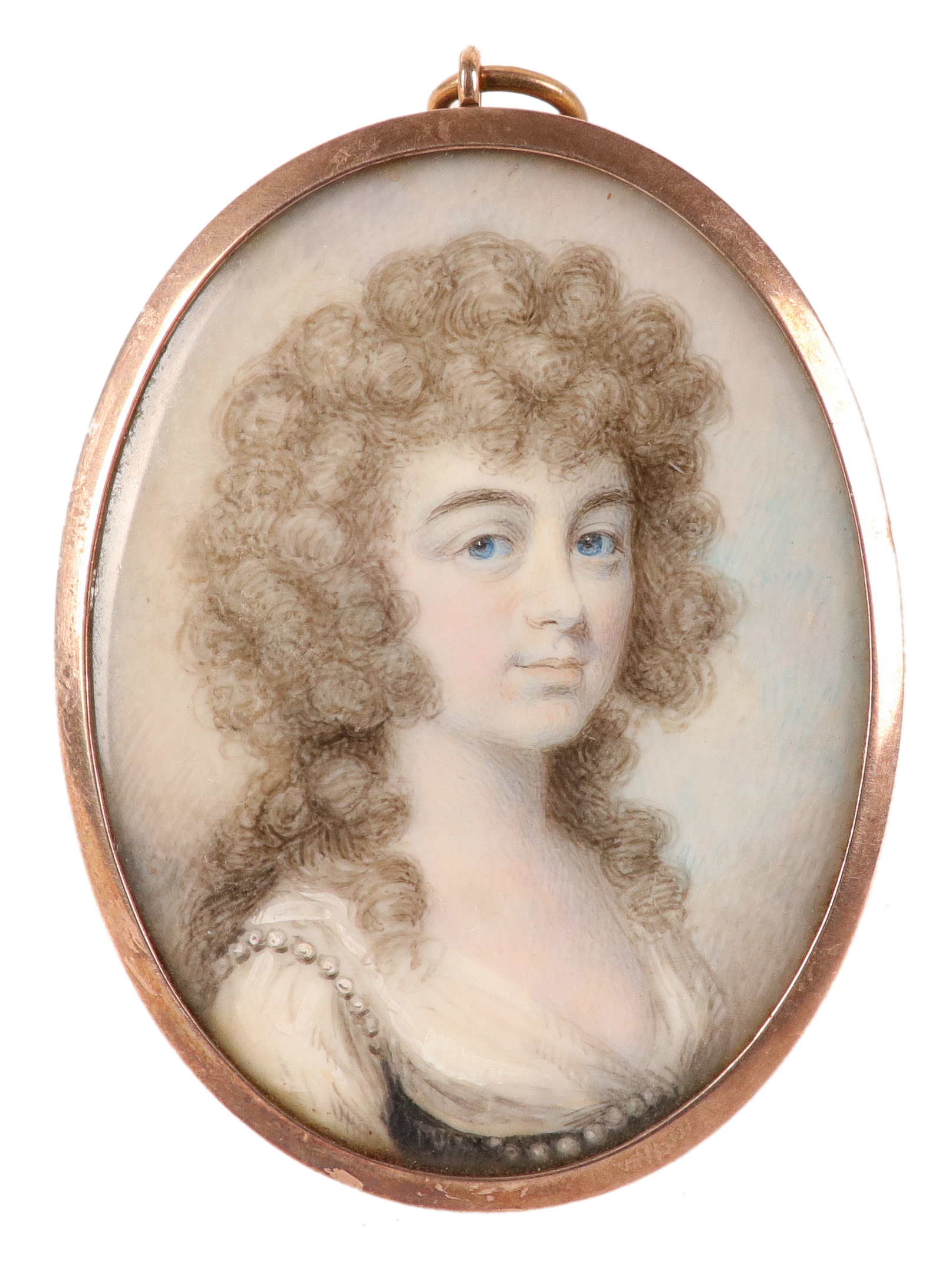 Portrait miniature of a lady wearing a white dress with pearl decoration