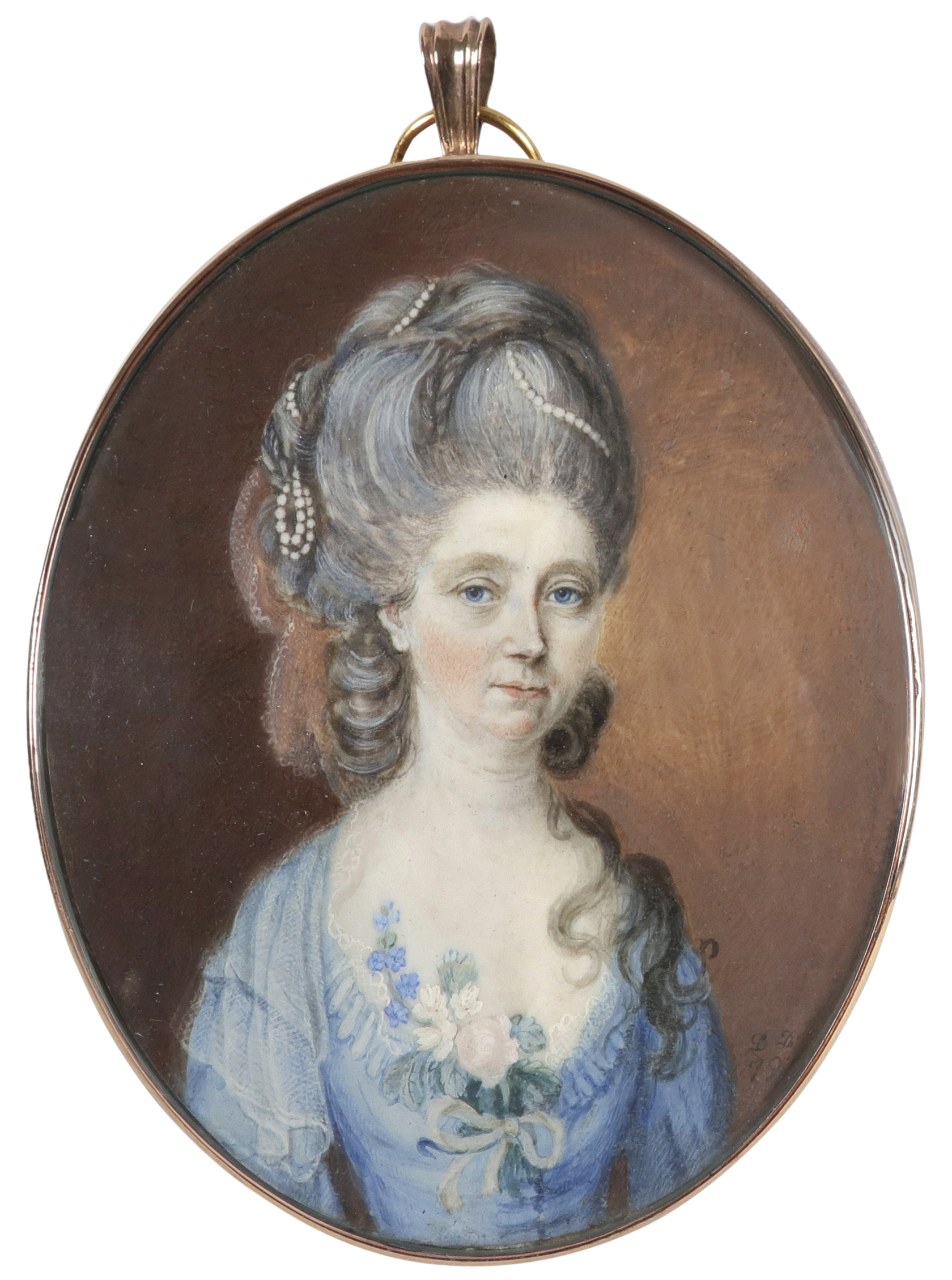 Portrait miniature of a lady wearing a blue dress, and pearls in her powdered hair