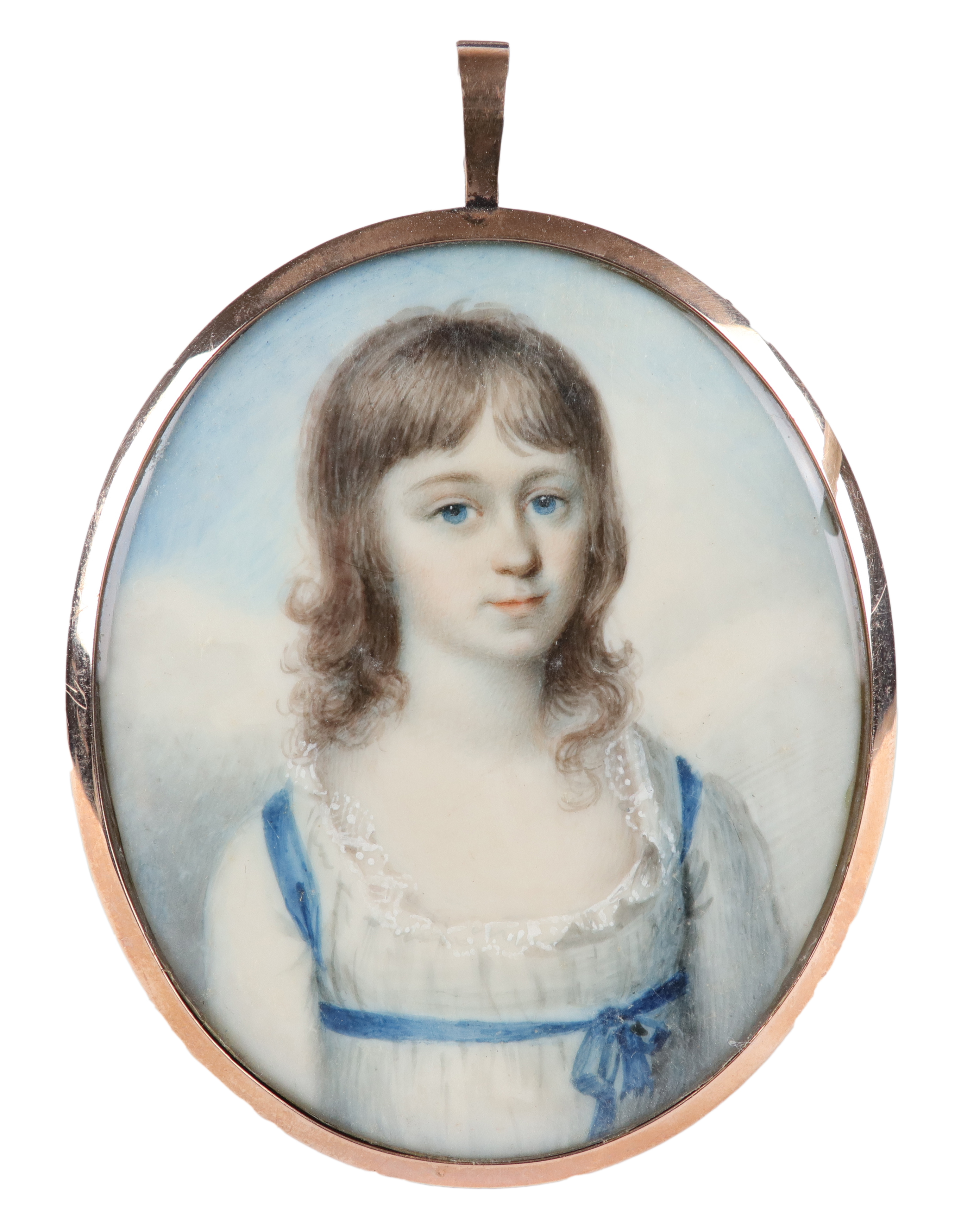 Portrait miniature of a young girl wearing a white dress with blue ribbons