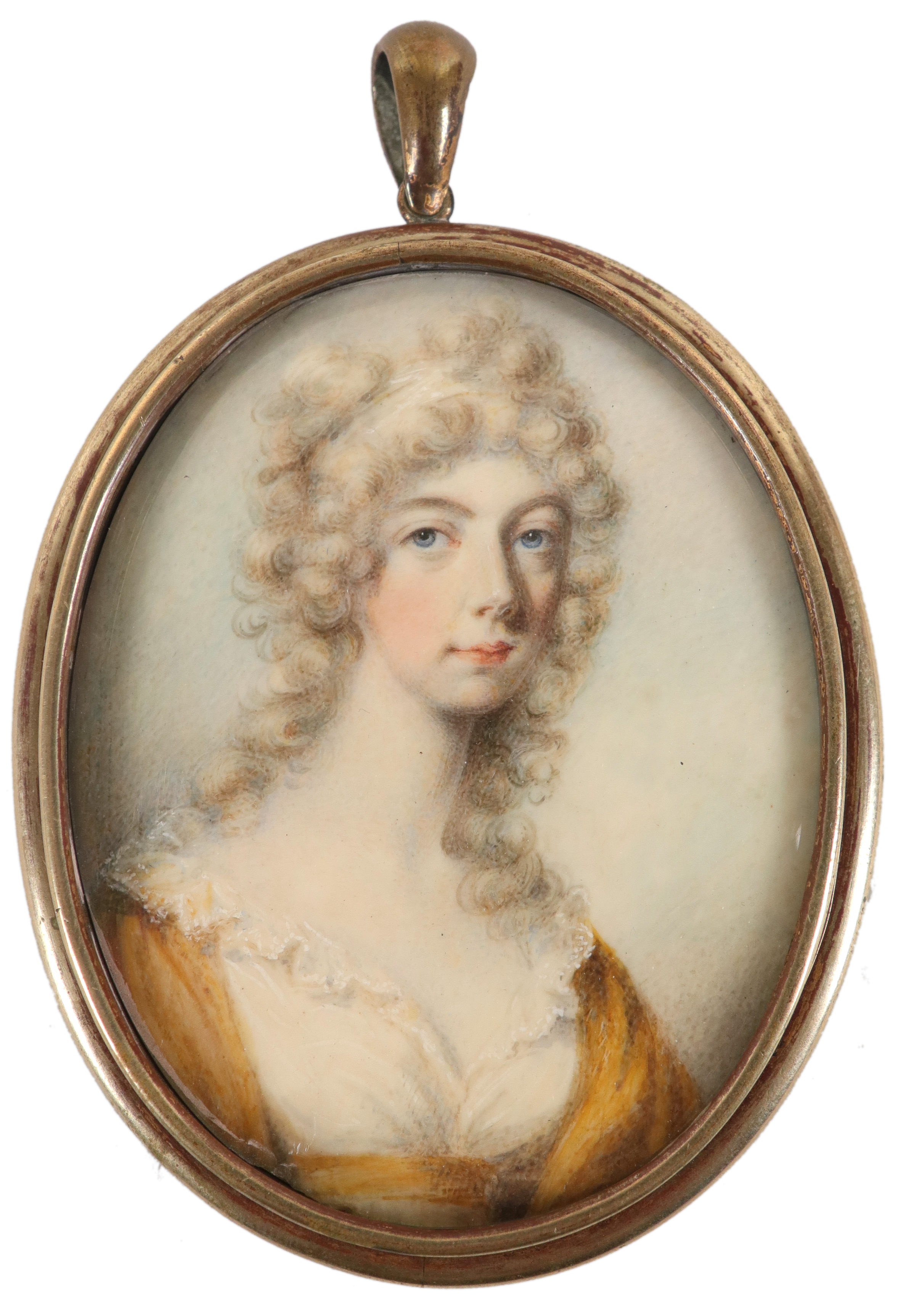 Portrait miniature of Mrs MacMahon, wearing a white and yellow dress, and white bandeau in her powdered hair