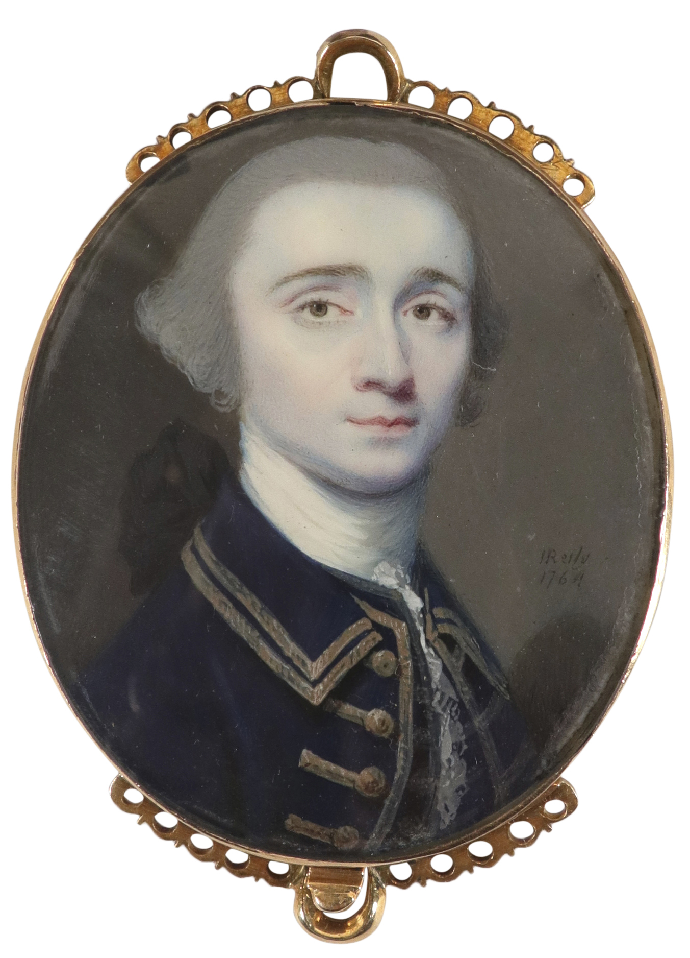 Portrait miniature of a gentleman wearing a blue trimmed coat and waistcoat, with powdered hair en queue
