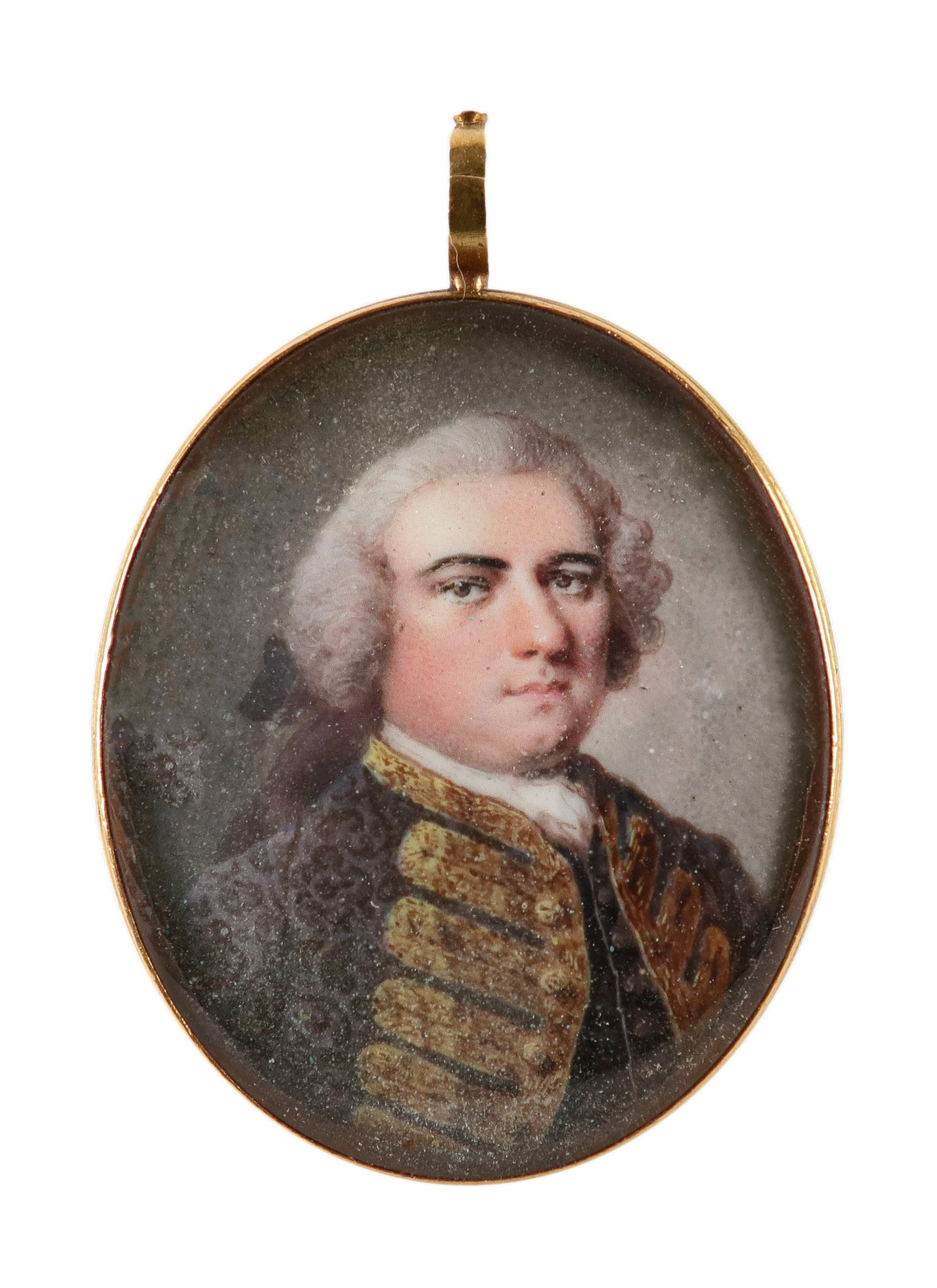 Portrait miniature of a gentleman wearing a grey embroidered coat with gold frogging, his powdered hair en queue