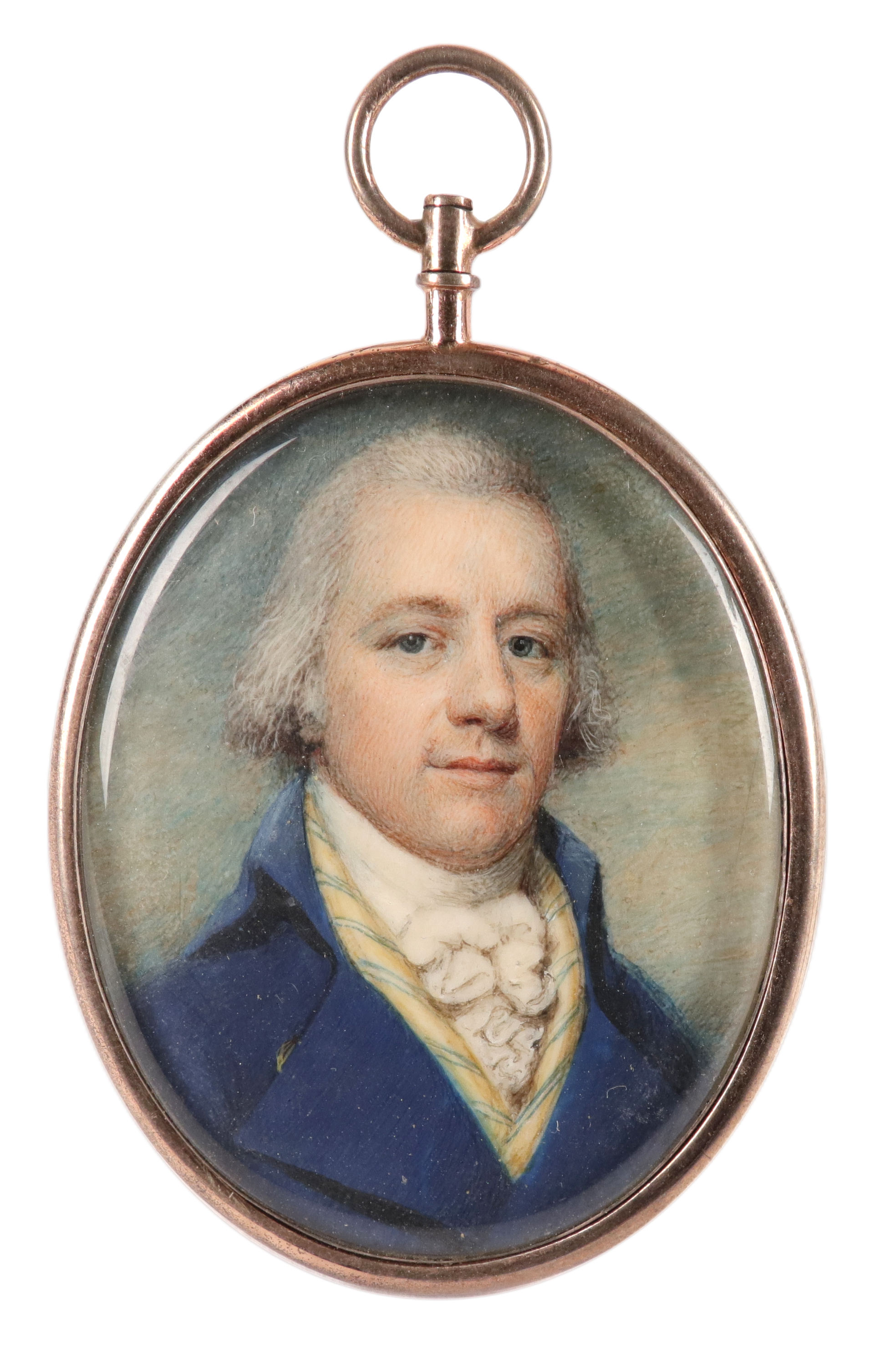 Portrait miniature of a gentleman wearing a blue coat and a yellow striped waistcoat
