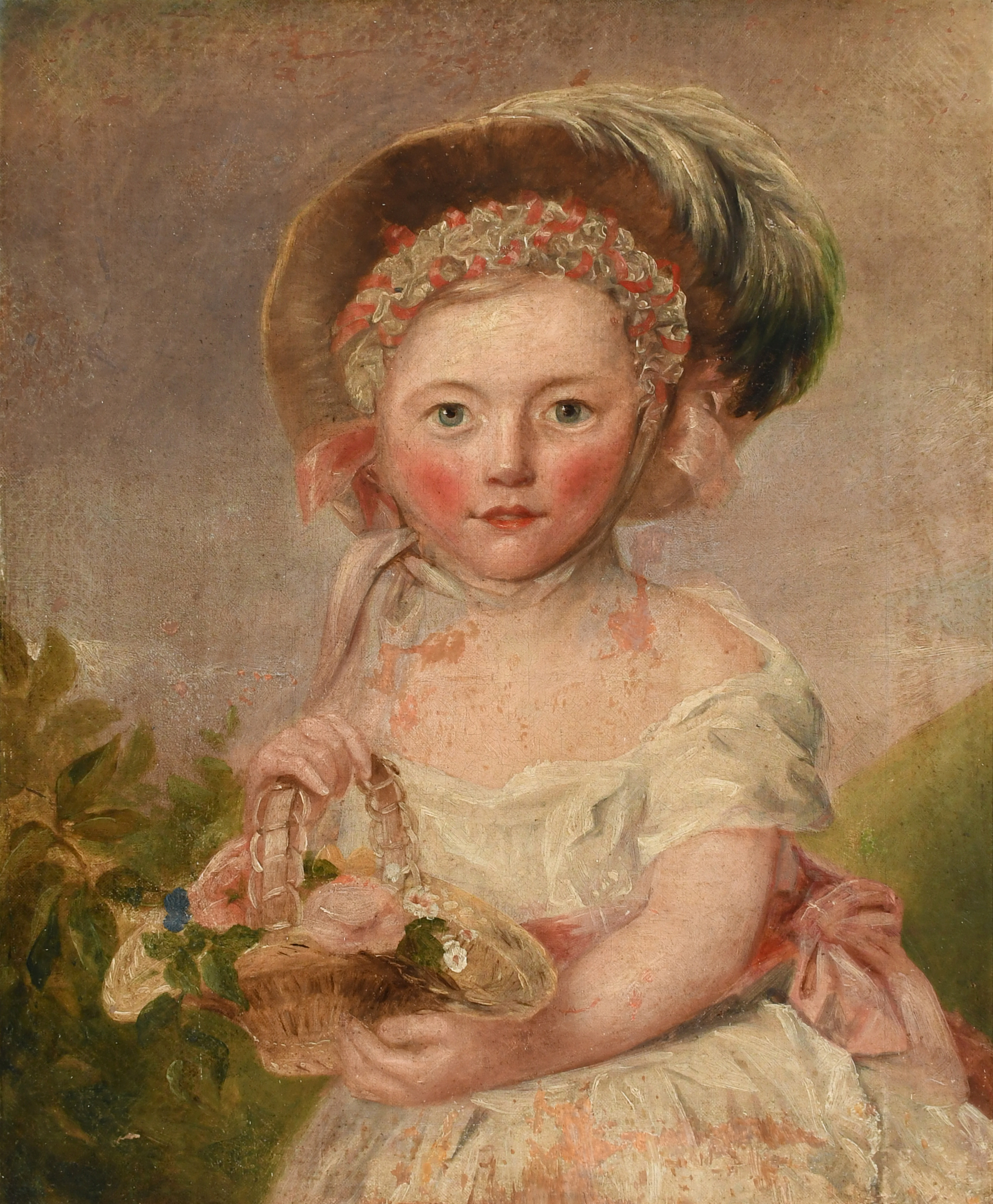 Portrait of a girl wearing a white dress and pink sash, holding a basket of flowers and sitting in a landscape