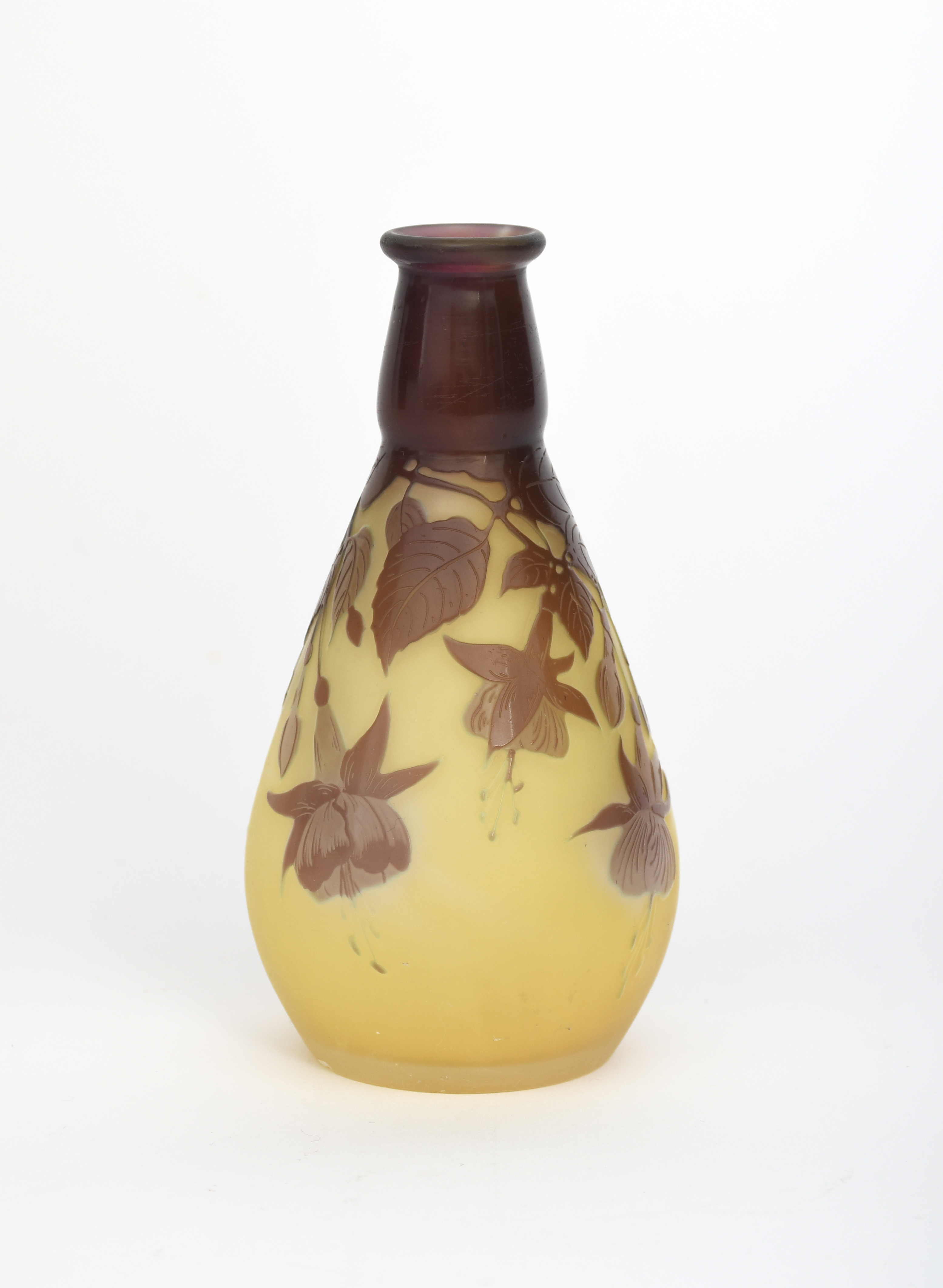 An Art Nouveau Galle cameo glass solifleur vase, tapering pear shape with knopped neck and flaring top rim, purple glass overlay decorated with trailing fuchsia flowers, on yellow glass body, cameo Galle signature, 14.5cm. high