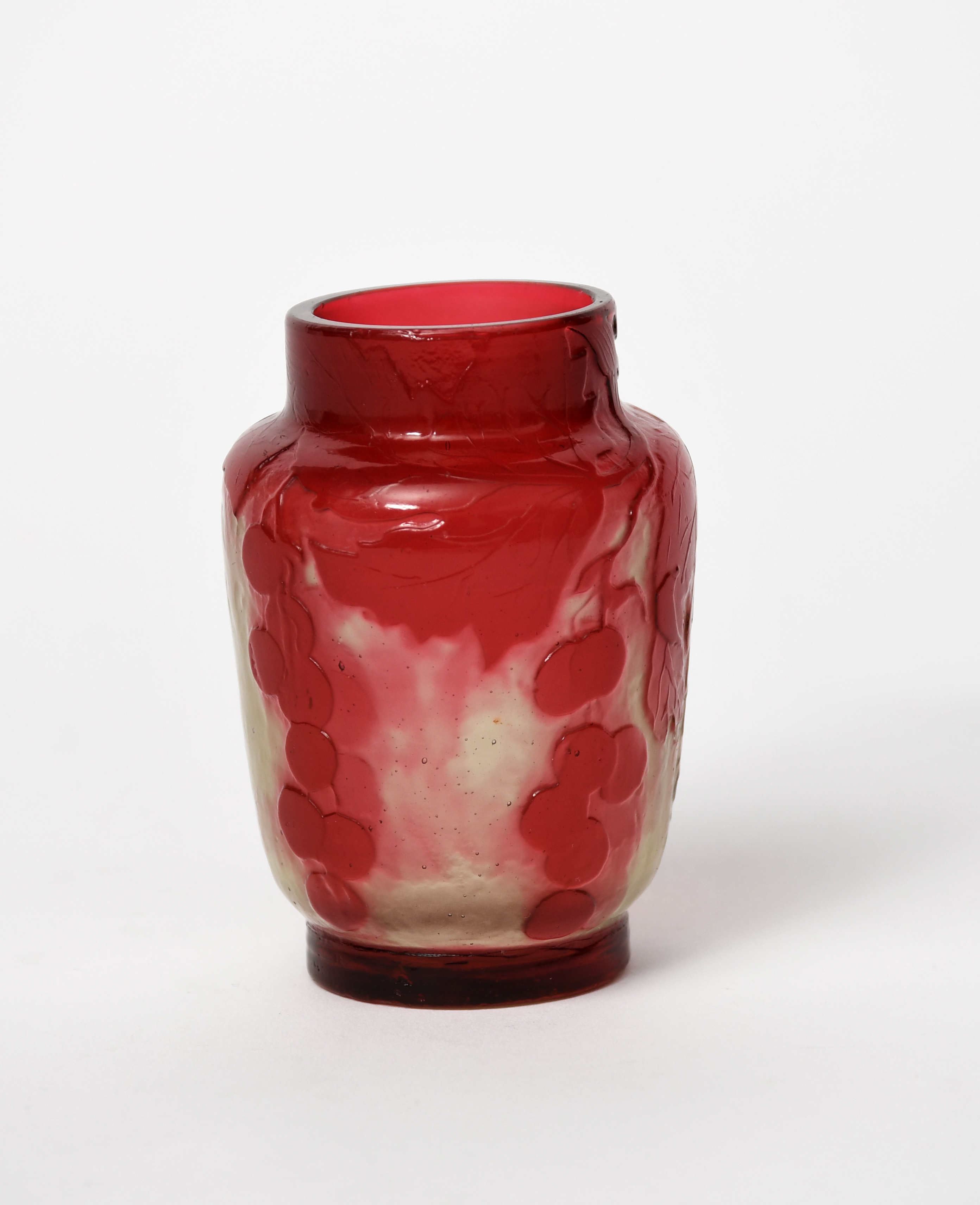An Art Nouveau Galle cameo glass vase designed by Emile Galle, shouldered cylindrical form, pink glass over opaque glass body, cameo decorated and polished with stylised grape bunches on a vine, cameo Galle signature, 7.7cm. high