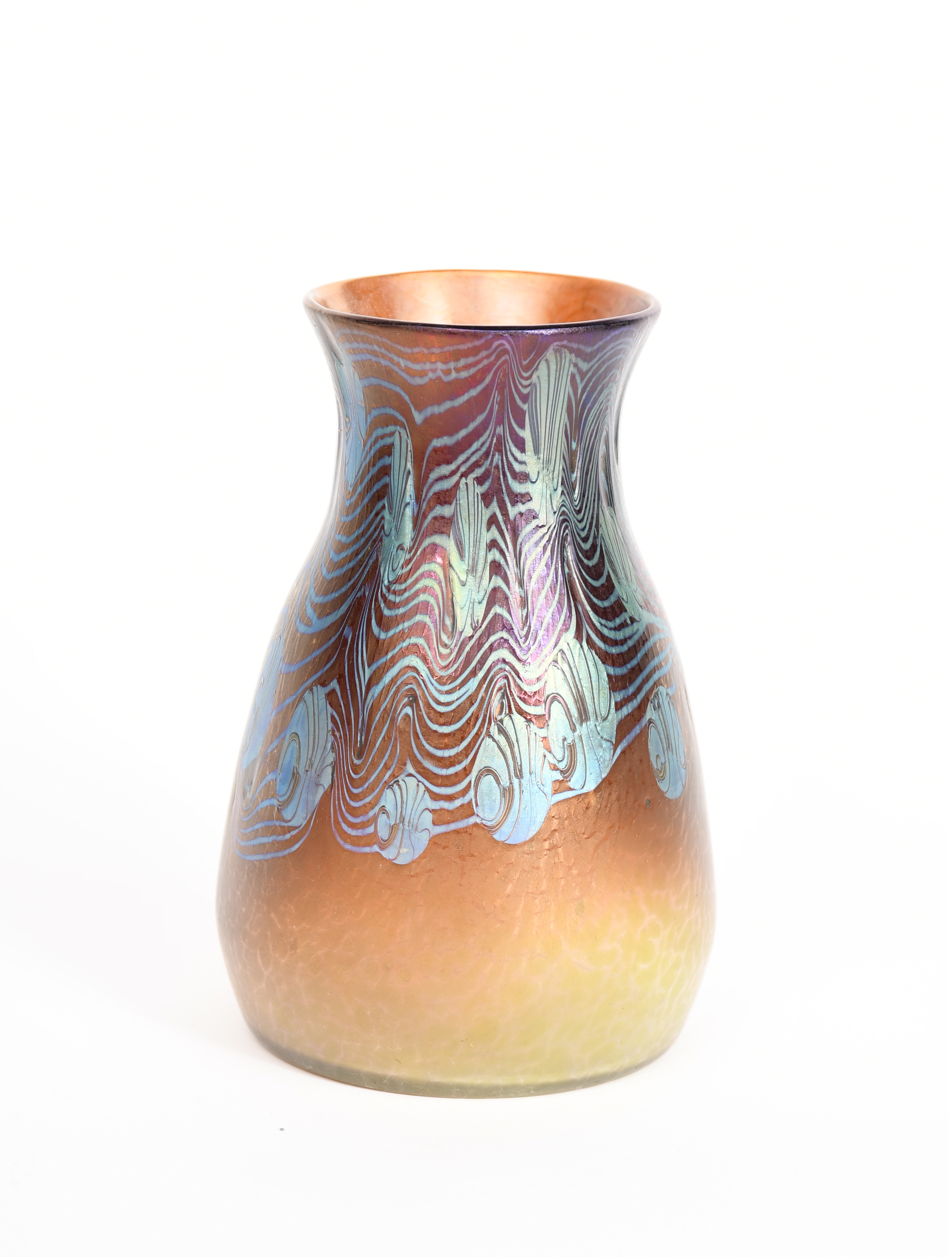 An Art Nouveau Loetz iridescent glass vase, shouldered form, trailed iridescent design to shoulder on textured golden lustre glass body, etched Loetz Austria, 17.5cm. high