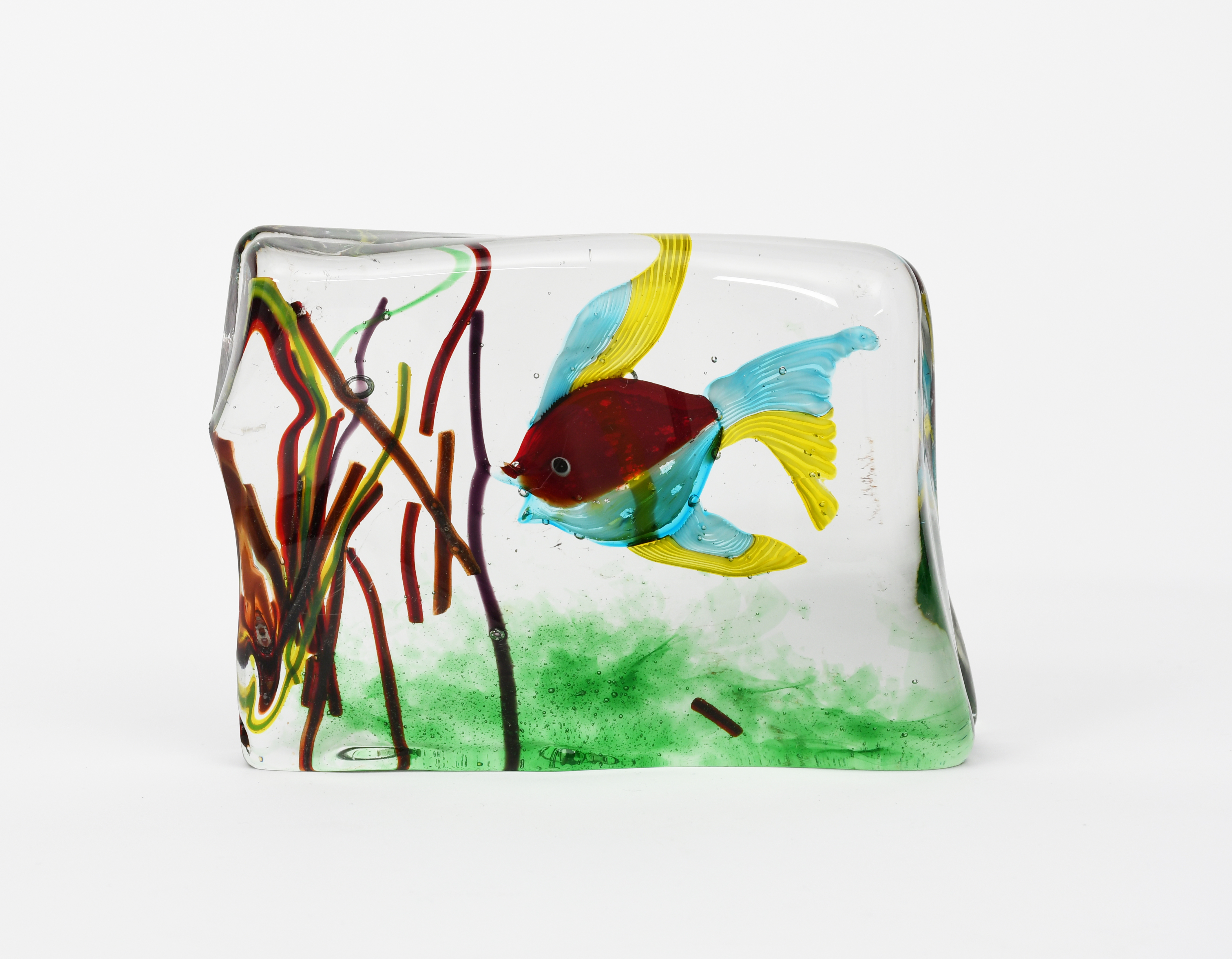 An Italian glass Aquarium probably Cenedese, rectangular form internally decorated with a tropical fish swimming amongst waterweed, cased in clear, unsigned 15cm wide, 11.5cm. high