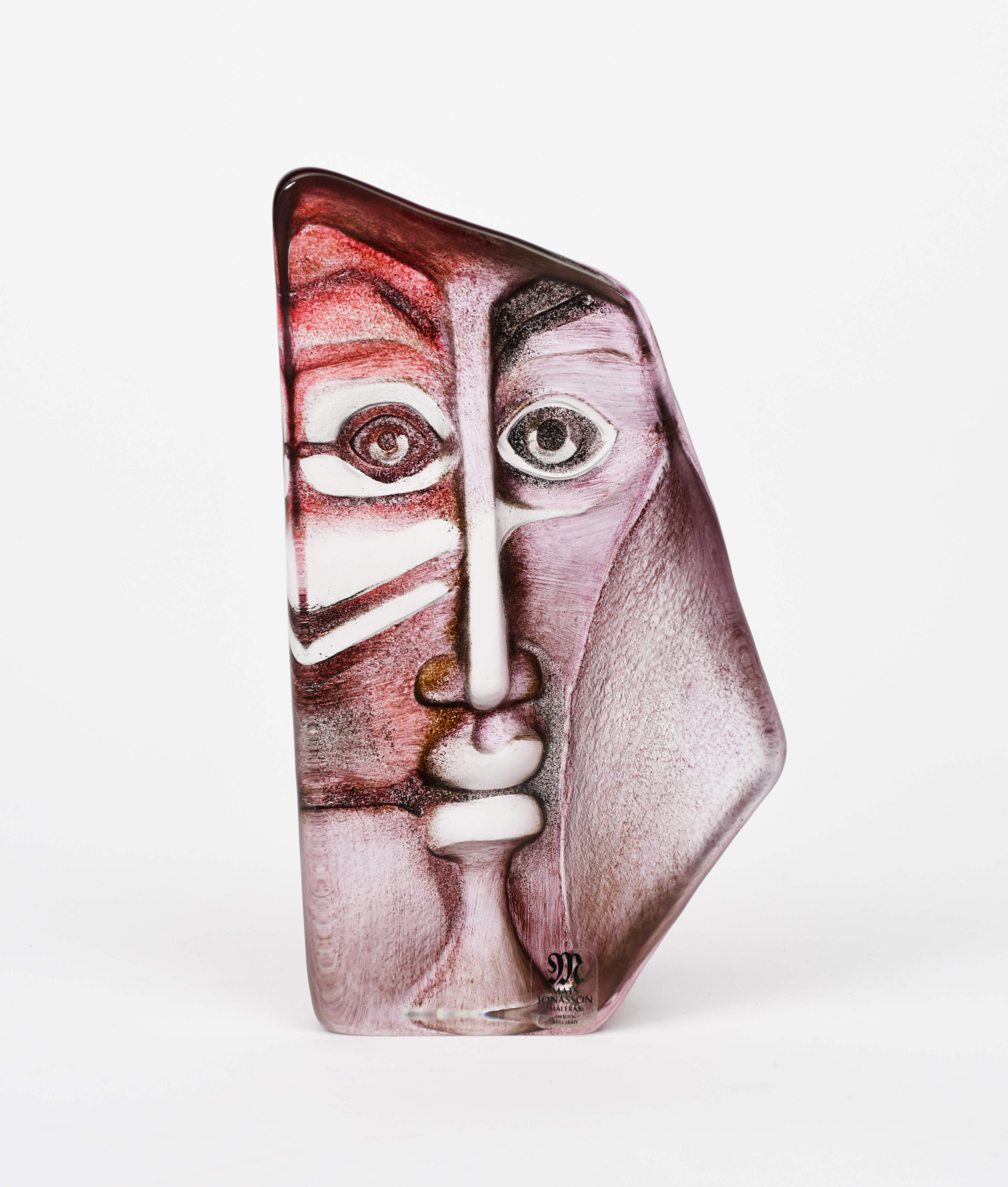 A Maleras glass block sculpture designed by Mats Jonasson, irregular form, reverse decorated with a portrait of a man, applied sticker label, etched marks to base, 14.5cm. high