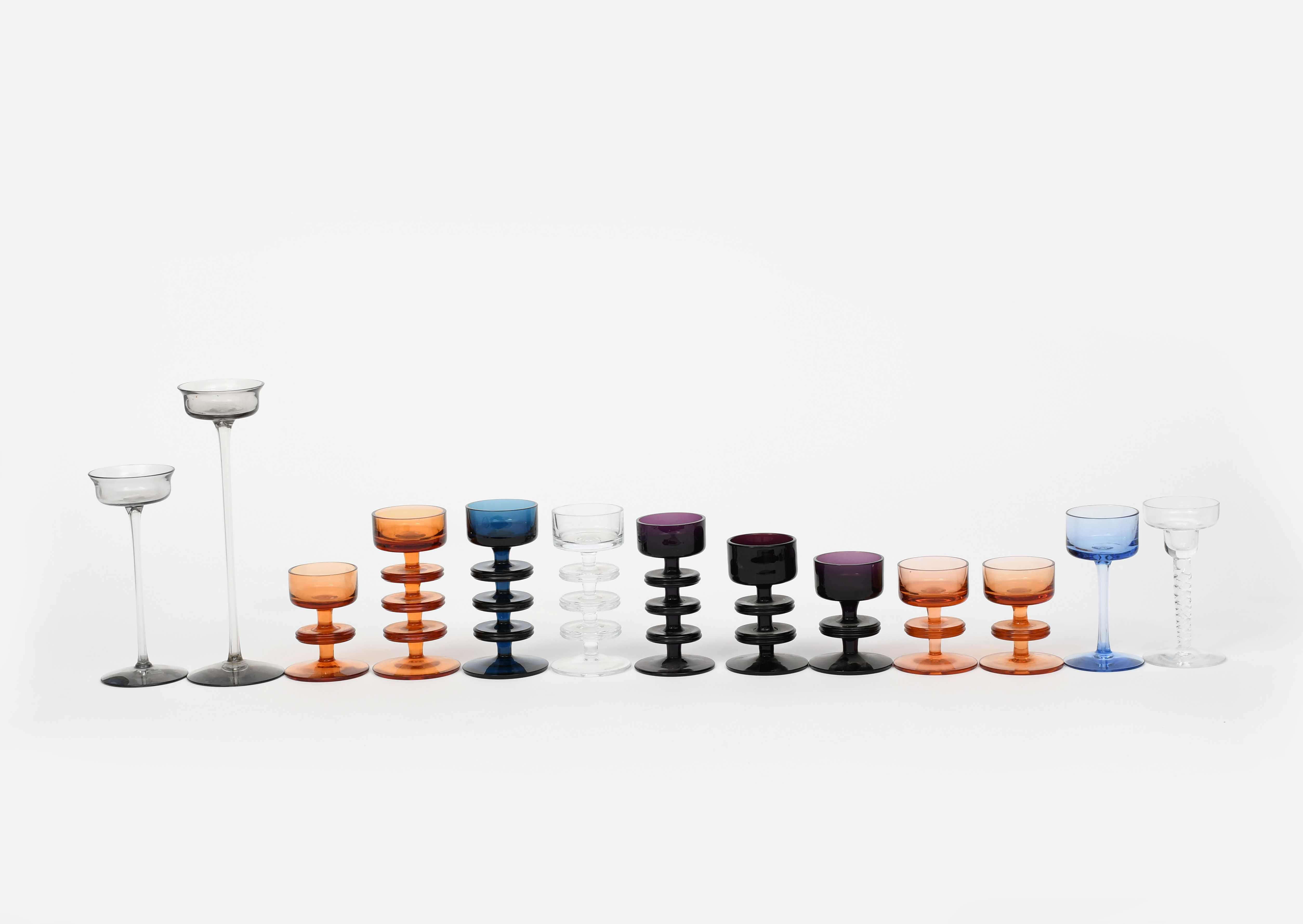A Wedgwood dark blue glass Sheringham three tier candle holder designed by Ronald Stennett-Willson, another three tier amethyst glass candle holder, seven other Sheringham candle holders, two graduated Wedgwood candle holders, a Wedgwood Sapphire Brancaster candle holder and a clear Helix shaped candle holder, applied Wedgwood label to one, 15.5cm. high (dark blue Sherringham), (13)