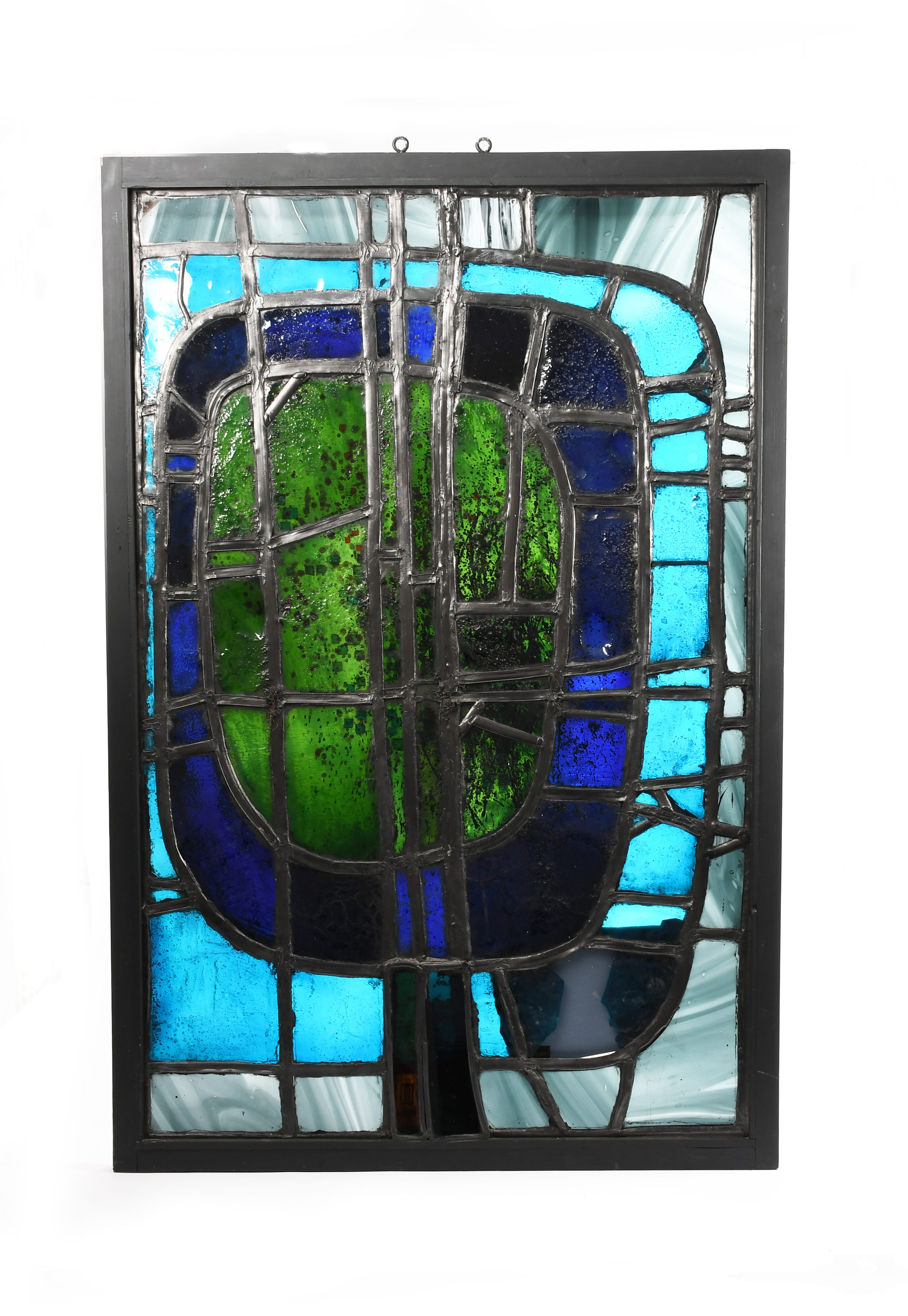 Abstract stained glass panel, dated 1961, in wooden frame,