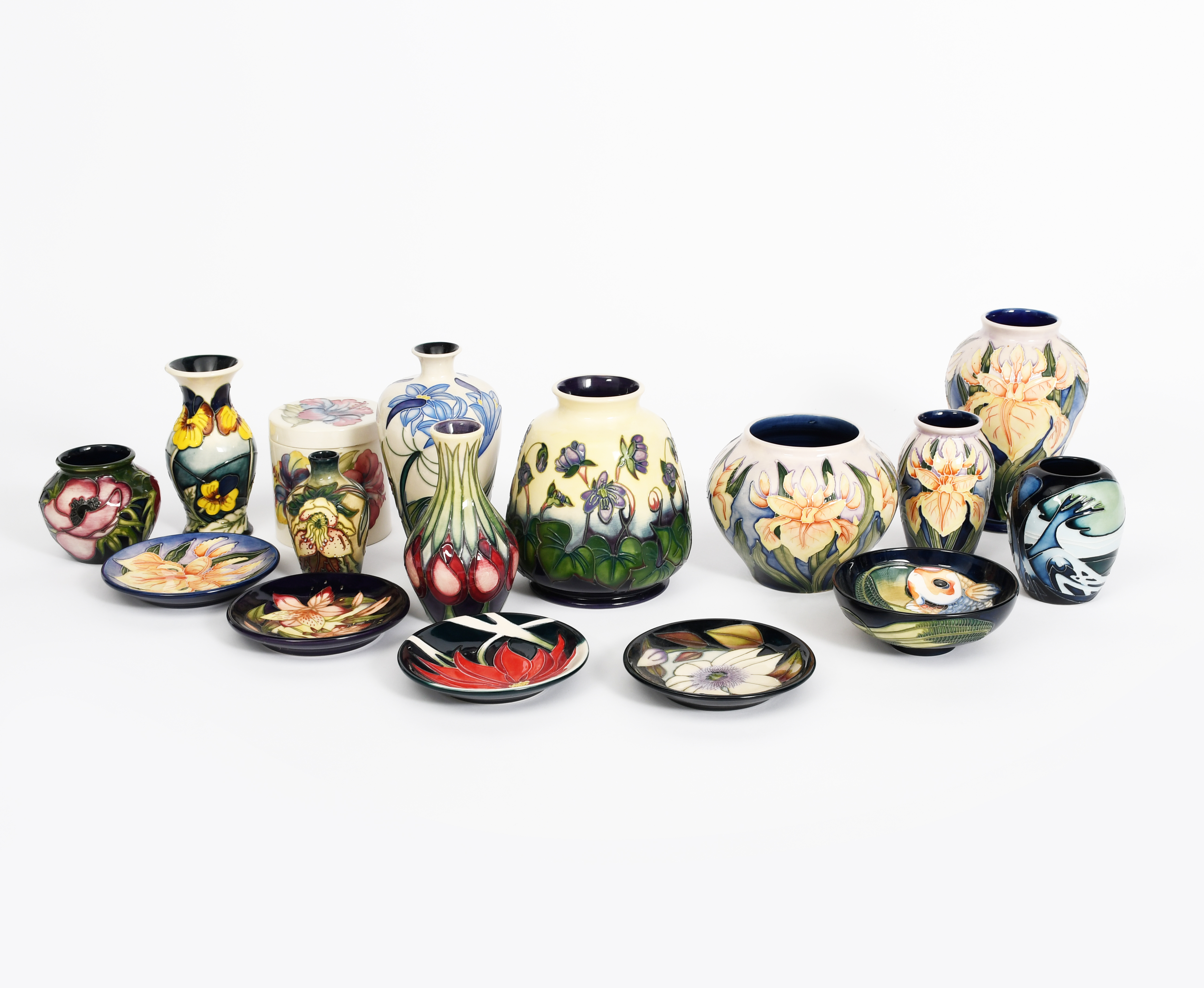 'Windrush - Yellow Iris' a modern Moorcroft Pottery vase, dated 2000, baluster form, tubeline decorated with flowers and foliage in colours on a graduated blue ground, another two in the same pattern, a shouldered vase decorated with blue anemones, a Moorcroft Hibiscus jar and cover, a Moorcroft 'Fly Away Home' vase, a vase dated 2006 painted with yellow flowers and nine other Moorcroft pieces impressed and painted marks, 15.5cm. high (16)