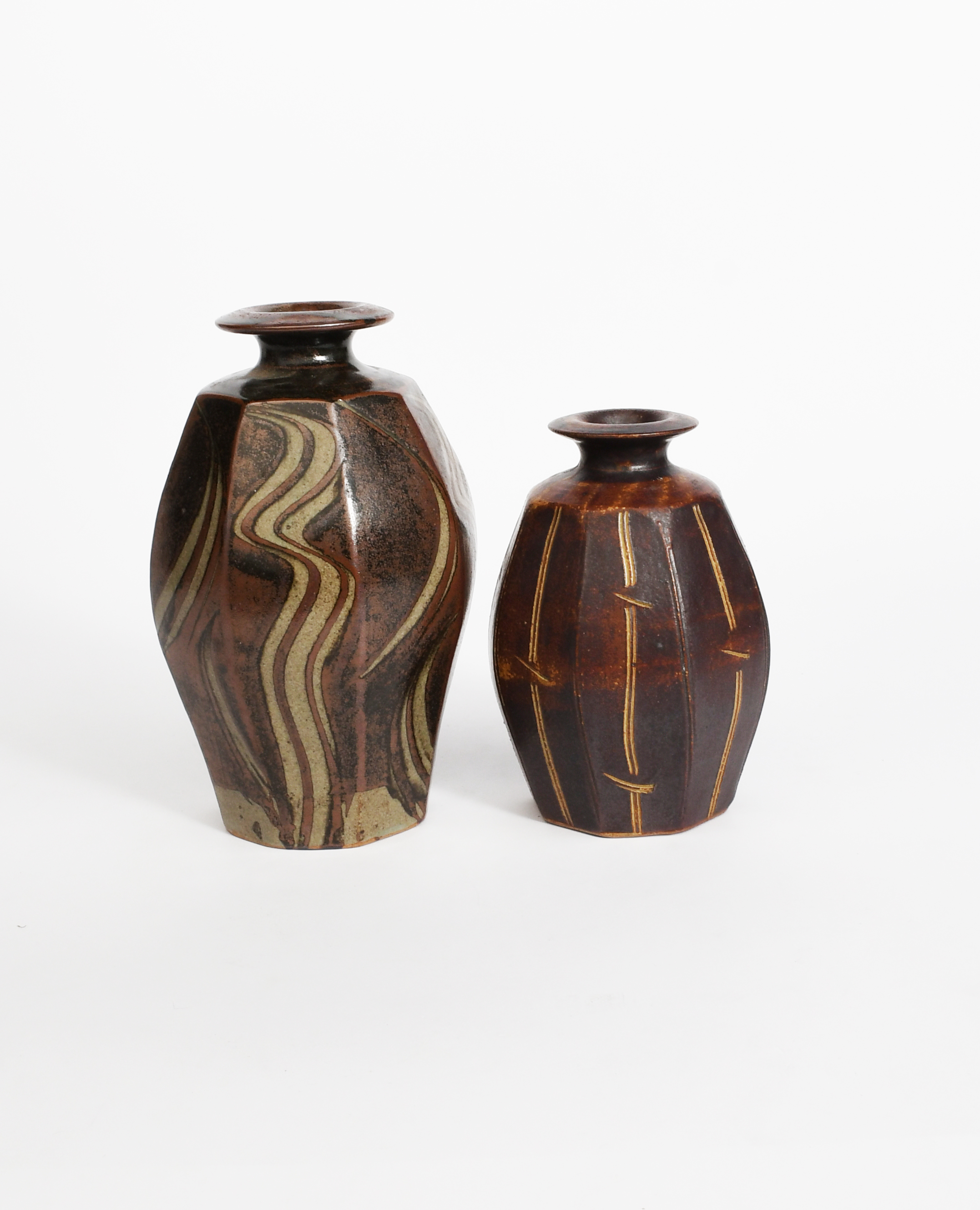 a cut-sided stoneware bottle vase, with flaring rim, covered to the foot with a tenmoku glaze with combed column design, and another smaller cut-sided stoneware vase by John Jelfs