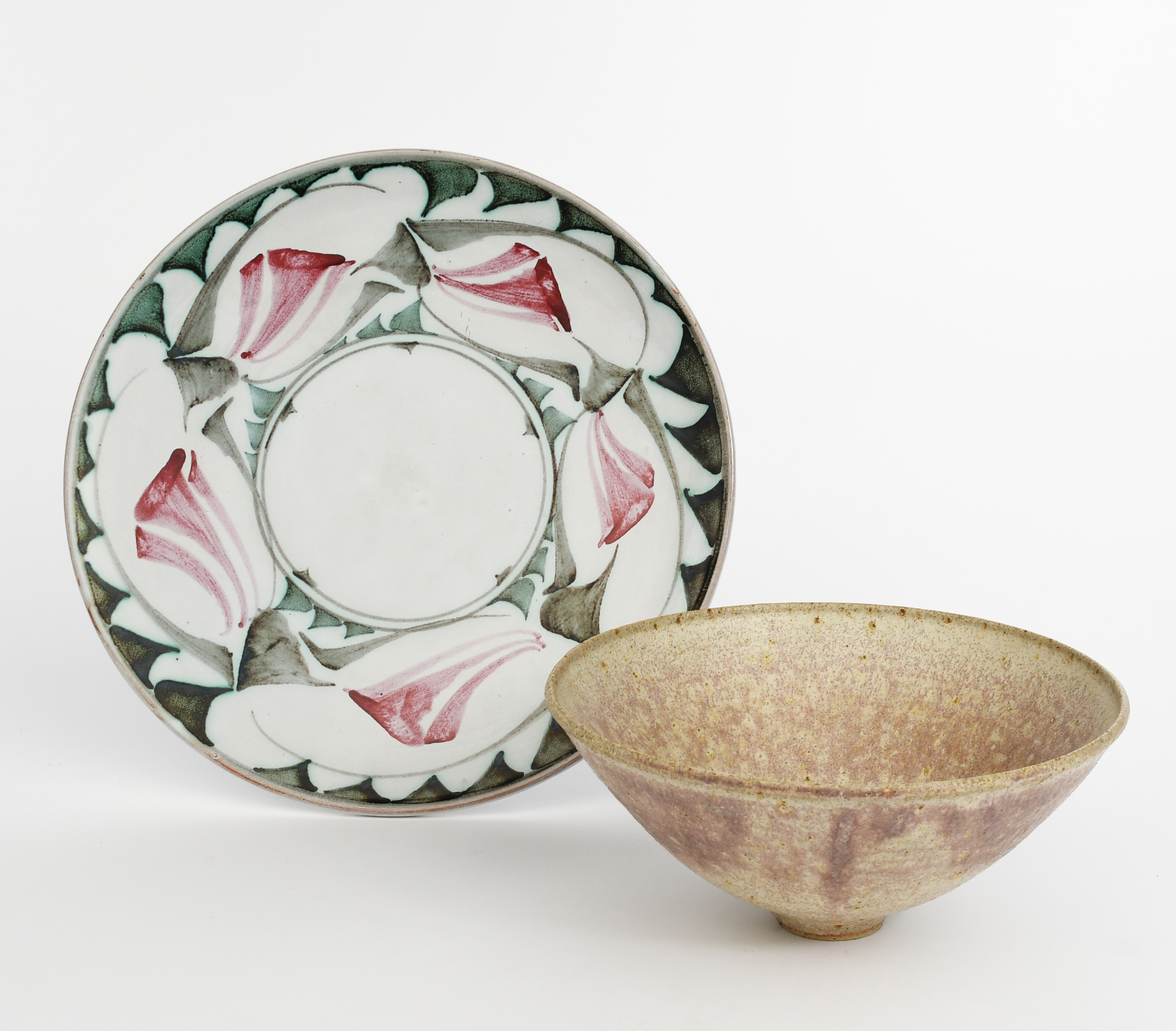 an Aldermaston Pottery plate, painted to the rim with a border of flowers in red, green and black on a grey tin-glaze, and a Peter Lane bowl covered with a running and pitted pink glaze over off-white