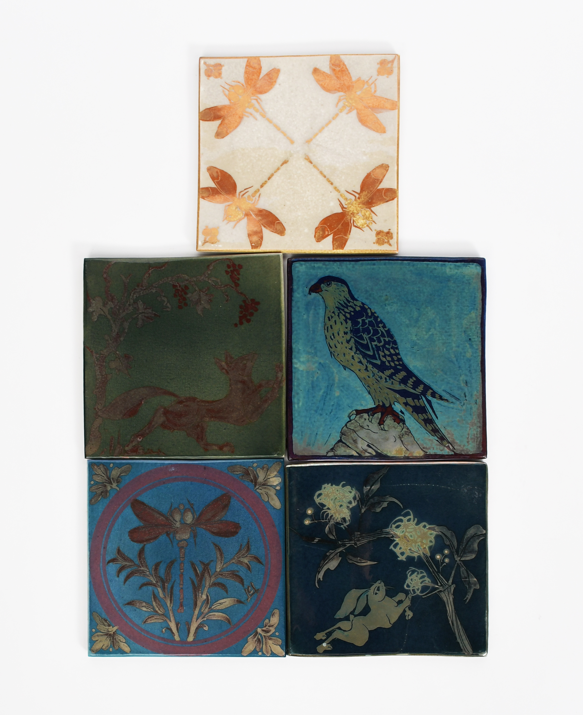 a set of five hand-built lustre tiles, each painted with dragonfly, fox, hare and falcon motif,