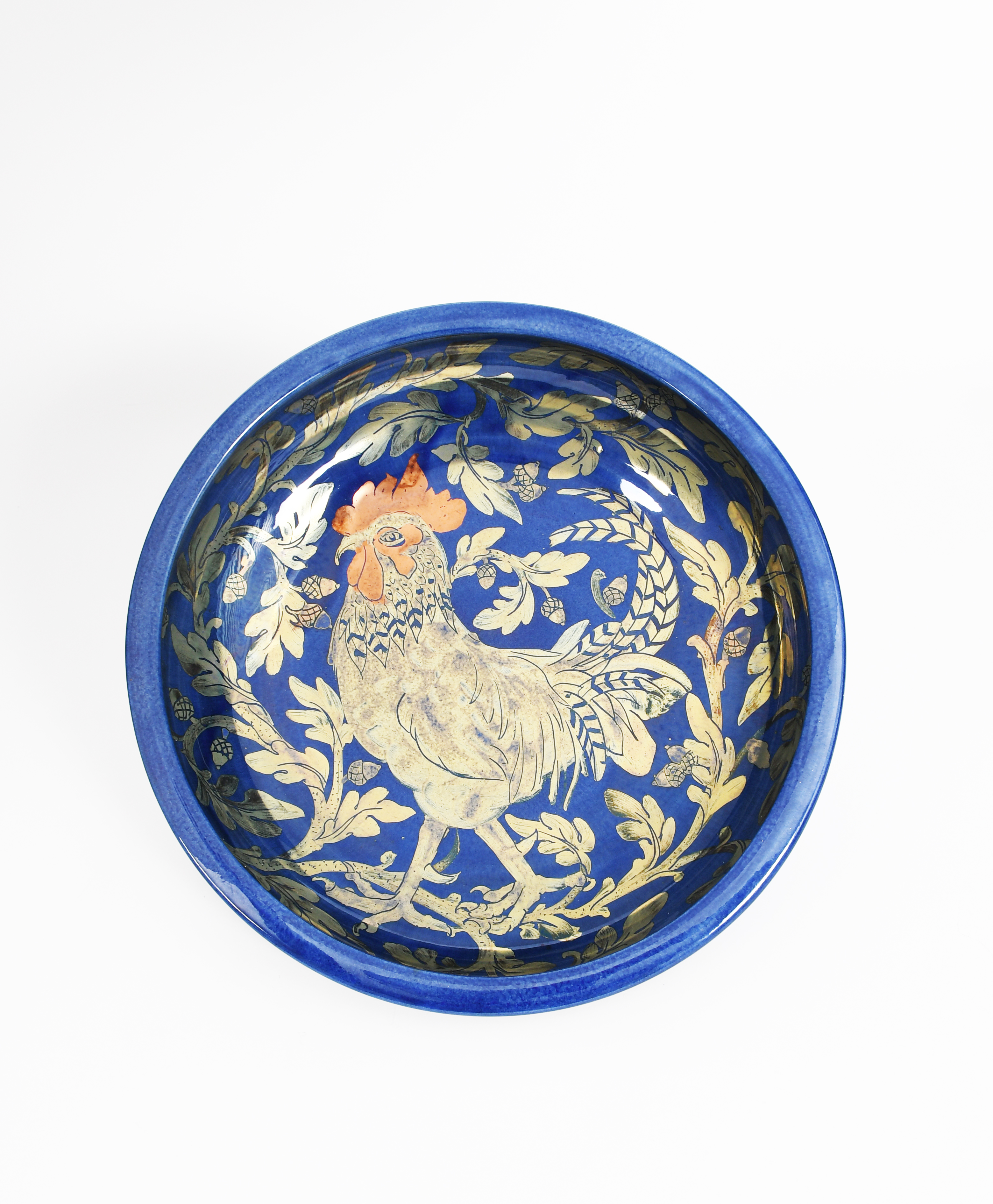 a pottery deep welled wall charger, painted with a cockerel amongst oak boughs, in gold and ruby lustre on a blue ground,